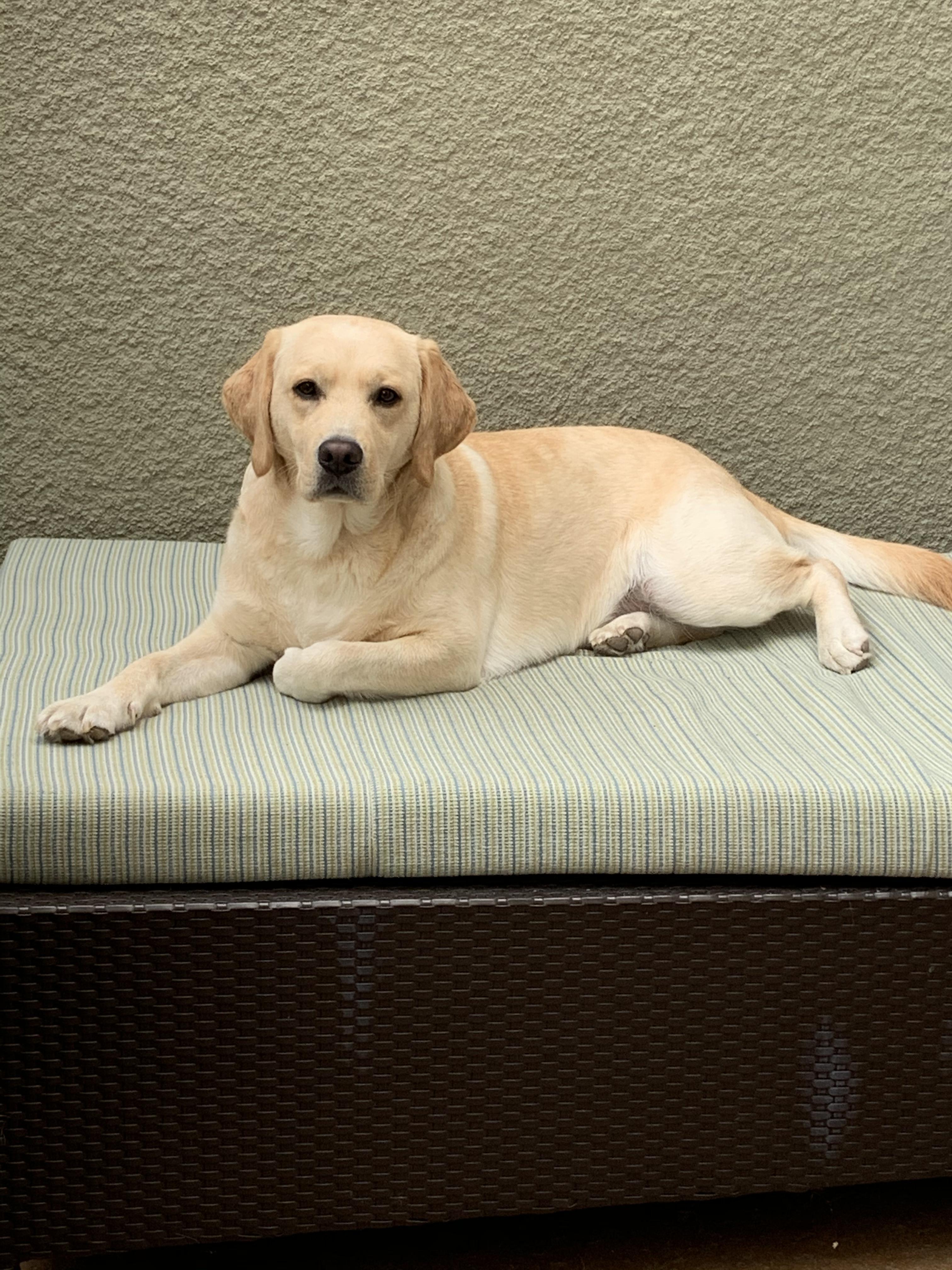 Watercolor painting of a yellow Labrador Retriever lying in a garden.