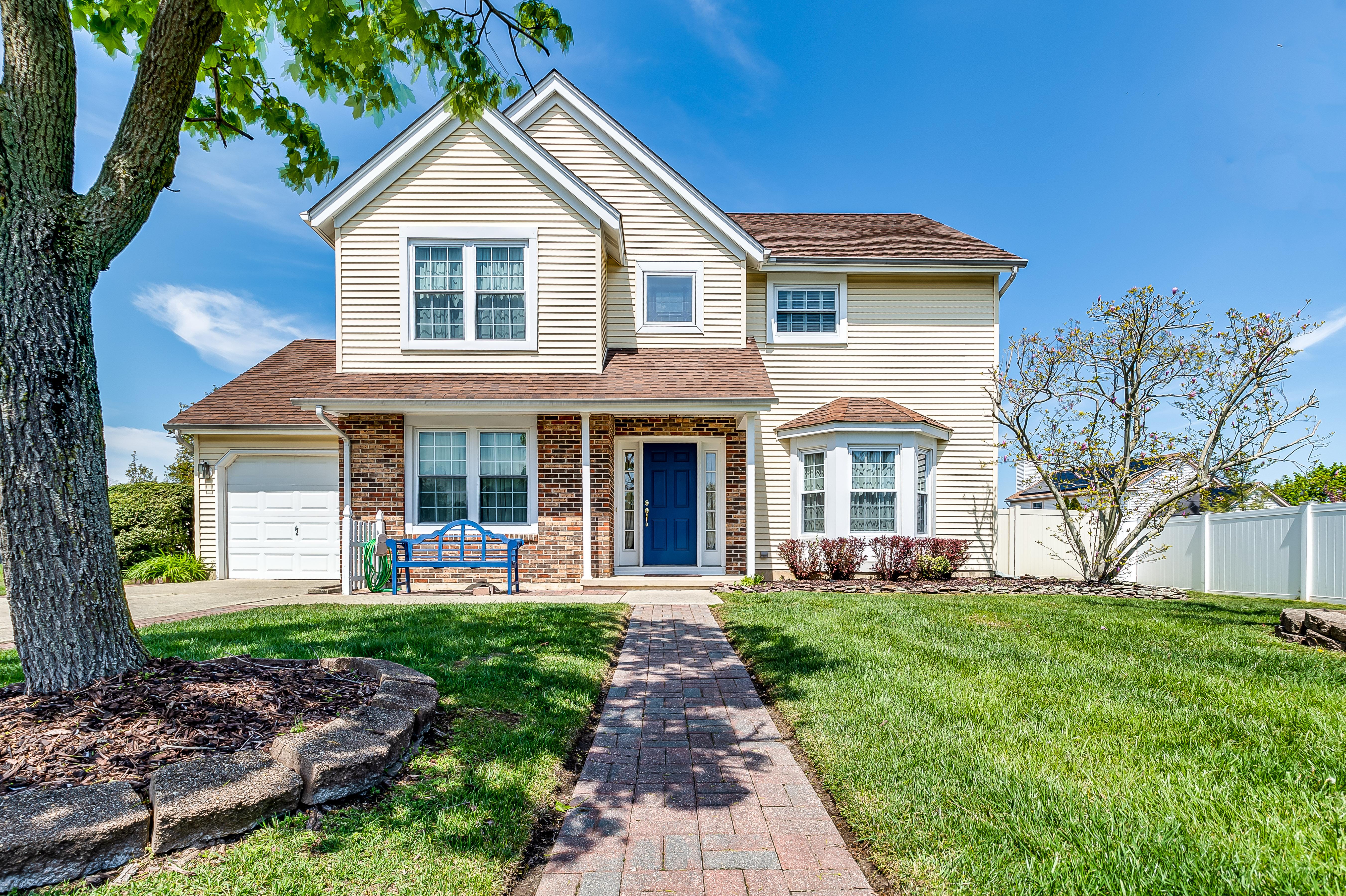 Watercolor painting of a two-story house with a blue door and a tree in the foreground.