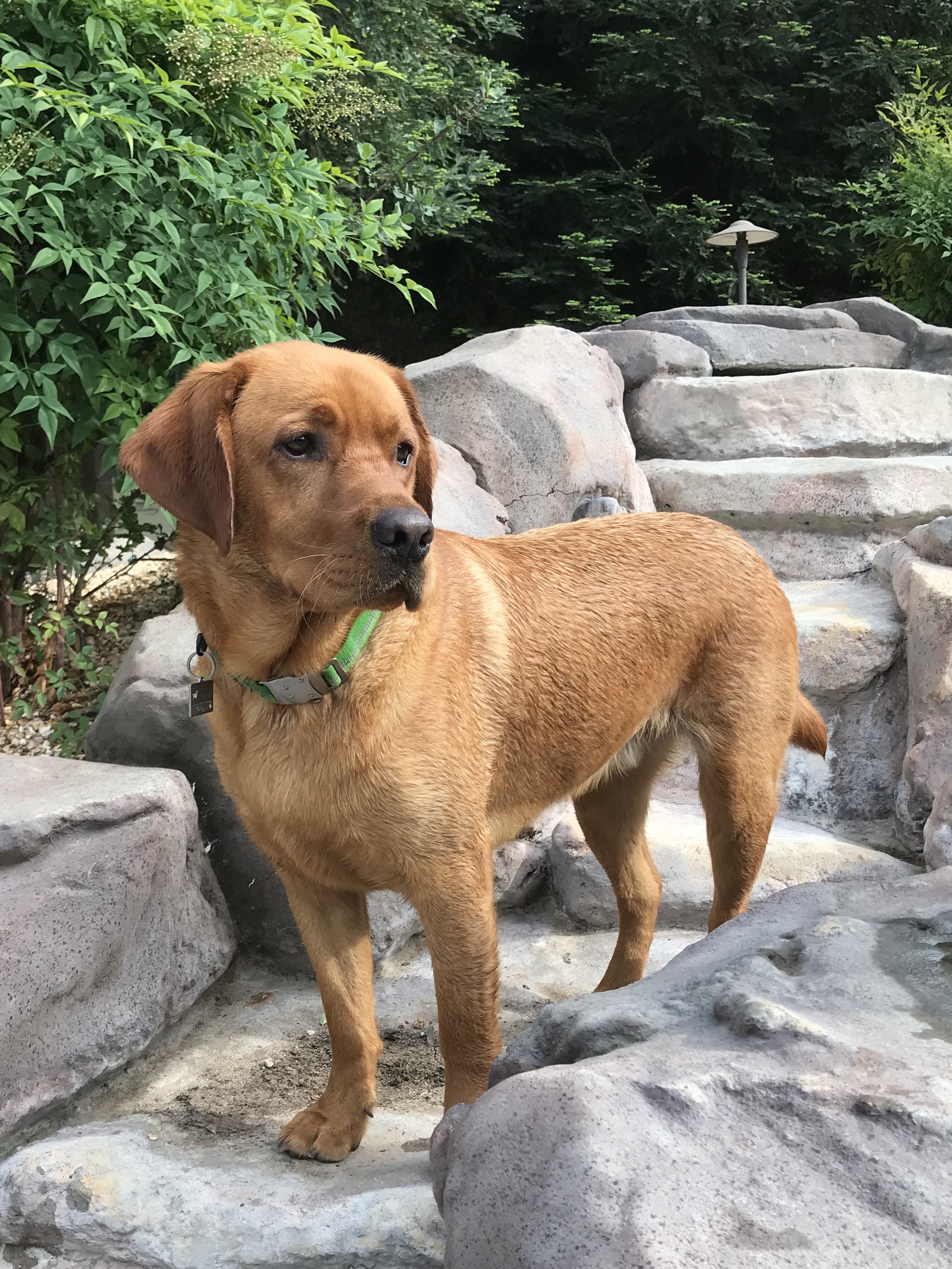 Watercolor painting of a reddish-brown Labrador Retriever wearing a green collar.