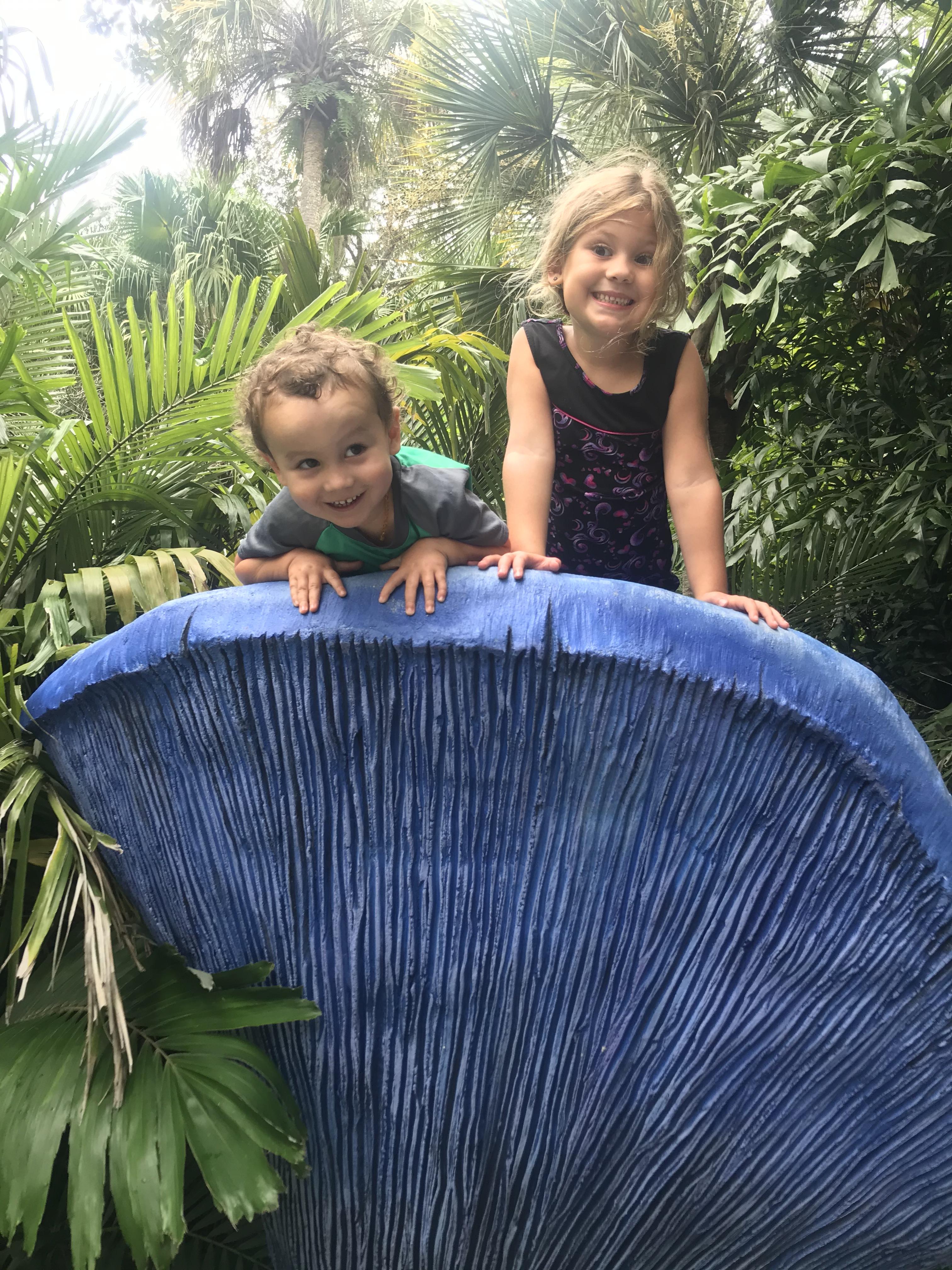 Watercolor painting of two children peeking over a large blue mushroom in a tropical garden.
