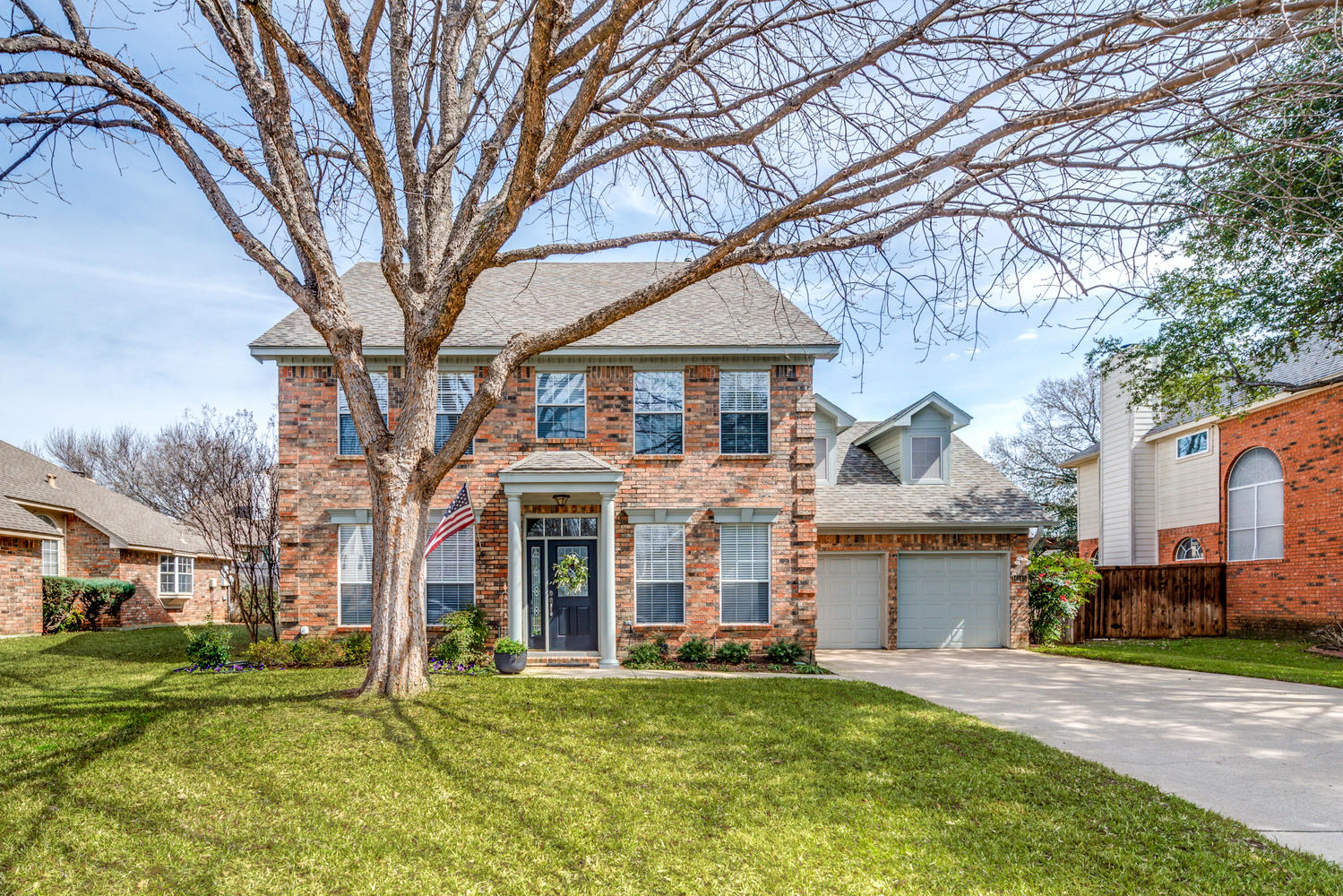 Watercolor painting of a brick house with a tree in the front yard and an American flag.