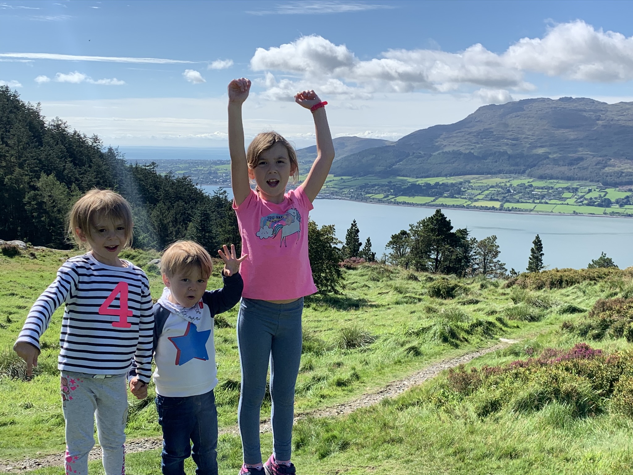 Watercolor painting of three happy children standing outdoors with their arms raised, in front of a lake and green hills.