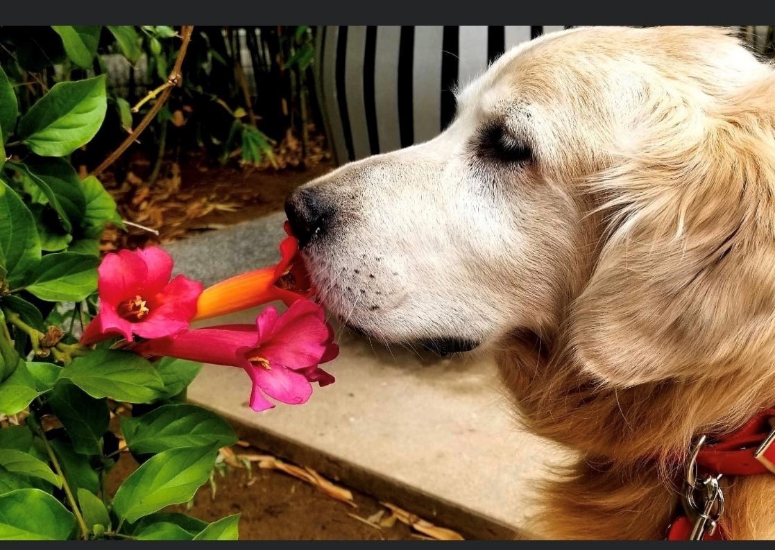 Watercolor painting of a golden retriever smelling pink flowers.