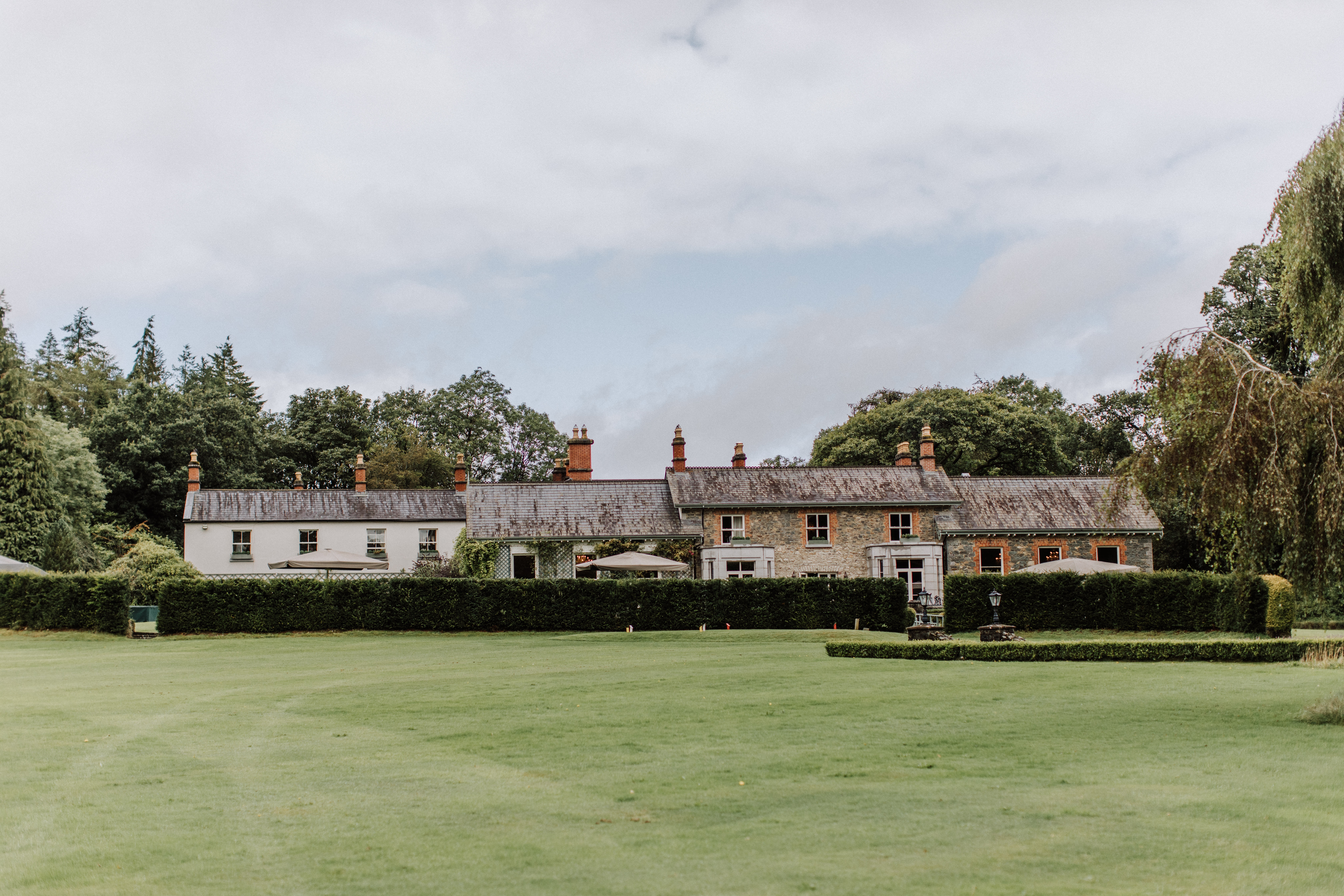 Watercolor painting of a long house viewed from across a lawn.