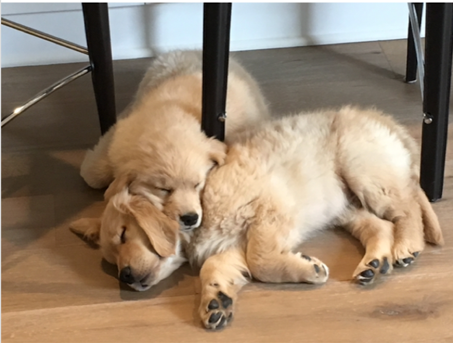 Watercolor painting of two golden retriever puppies sleeping together.