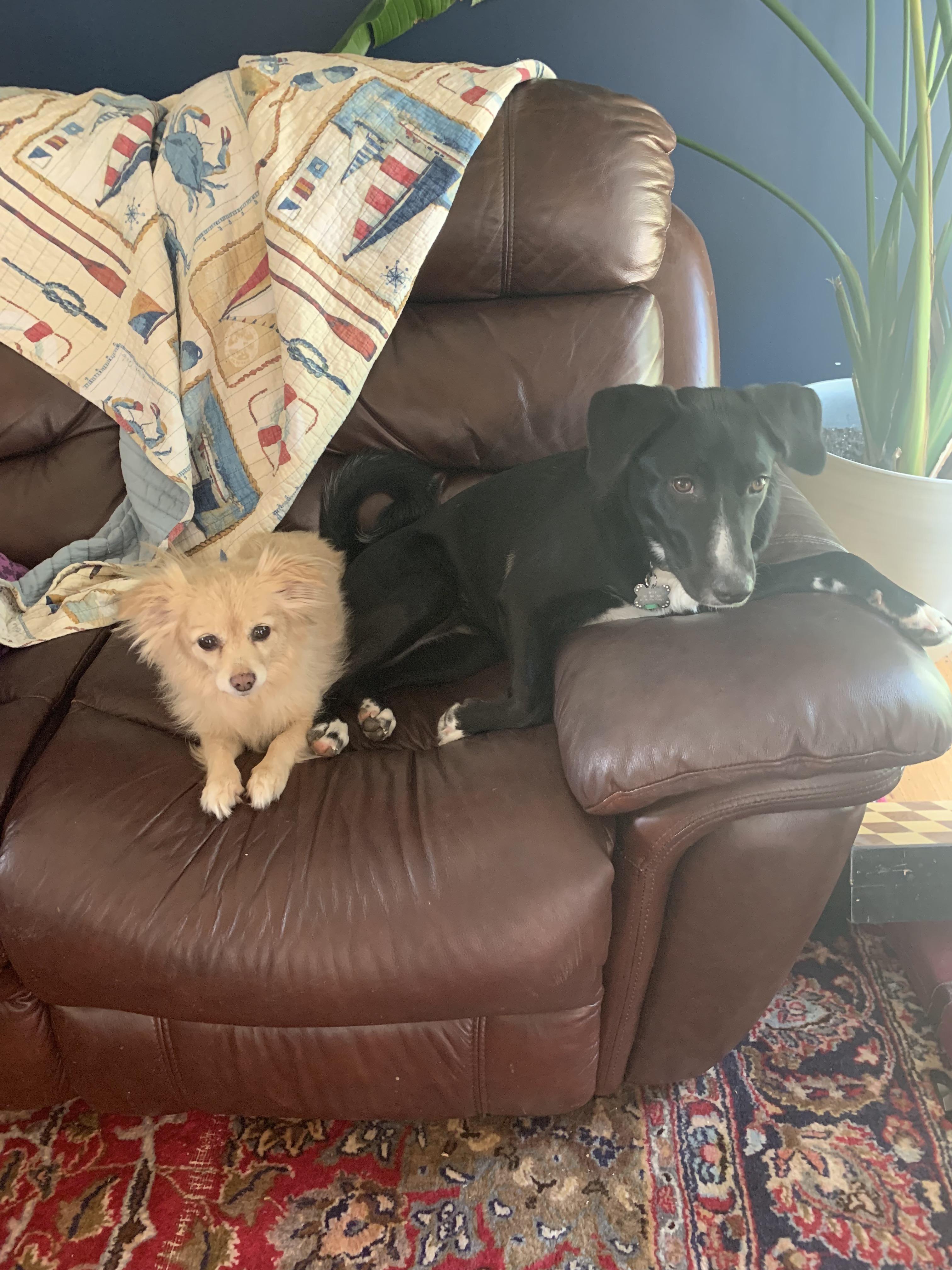 Watercolor painting of a black dog, a light brown dog, and a gray cat.