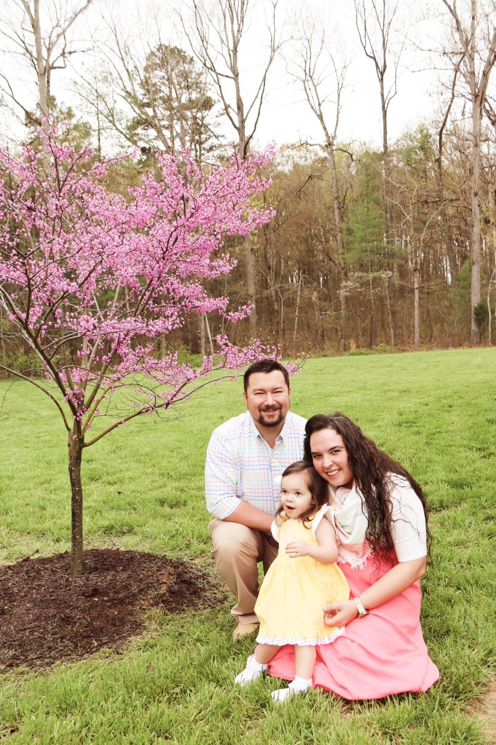 Watercolor painting of a family portrait: a father, mother, and young daughter sitting on the grass in front of a flowering tree.