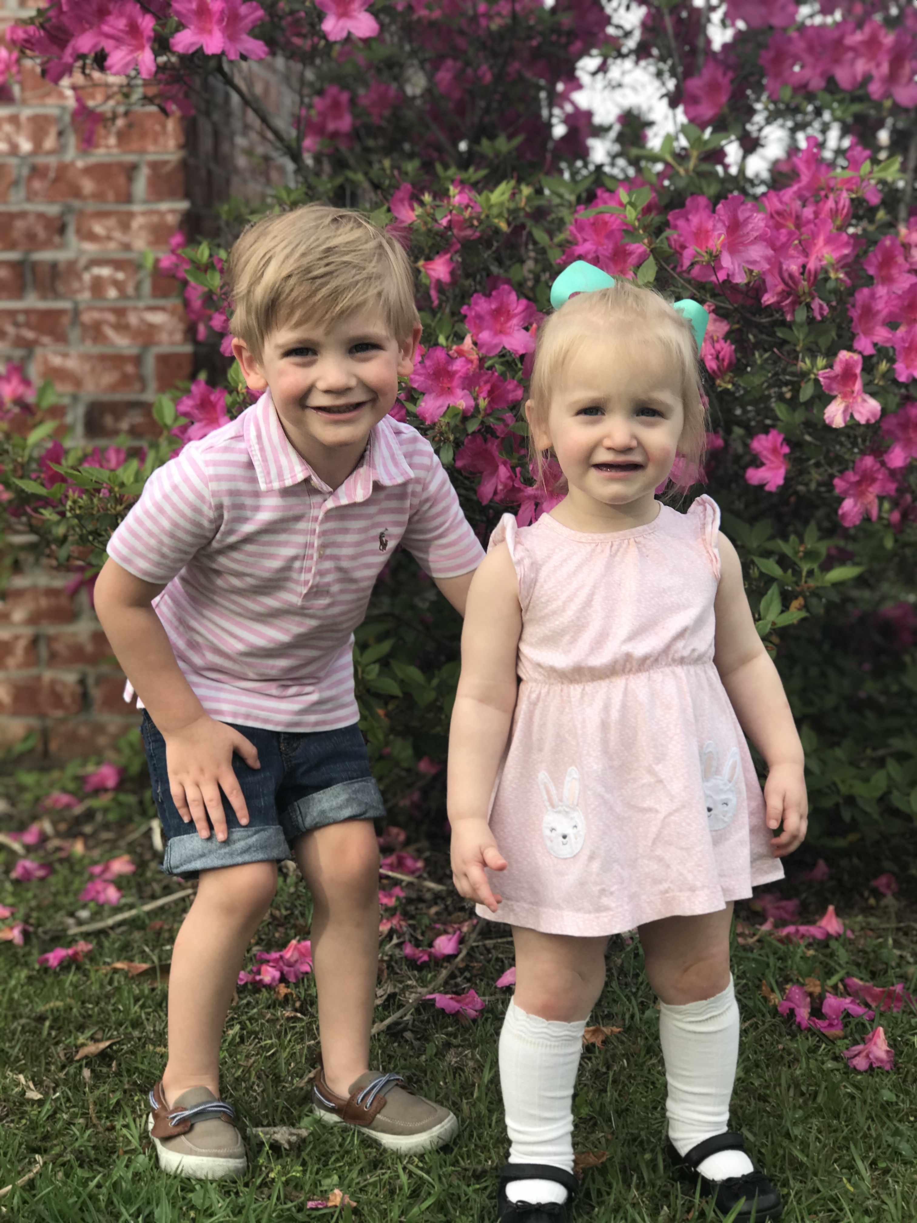 Watercolor portrait of a boy and girl in pink clothing standing in a garden.