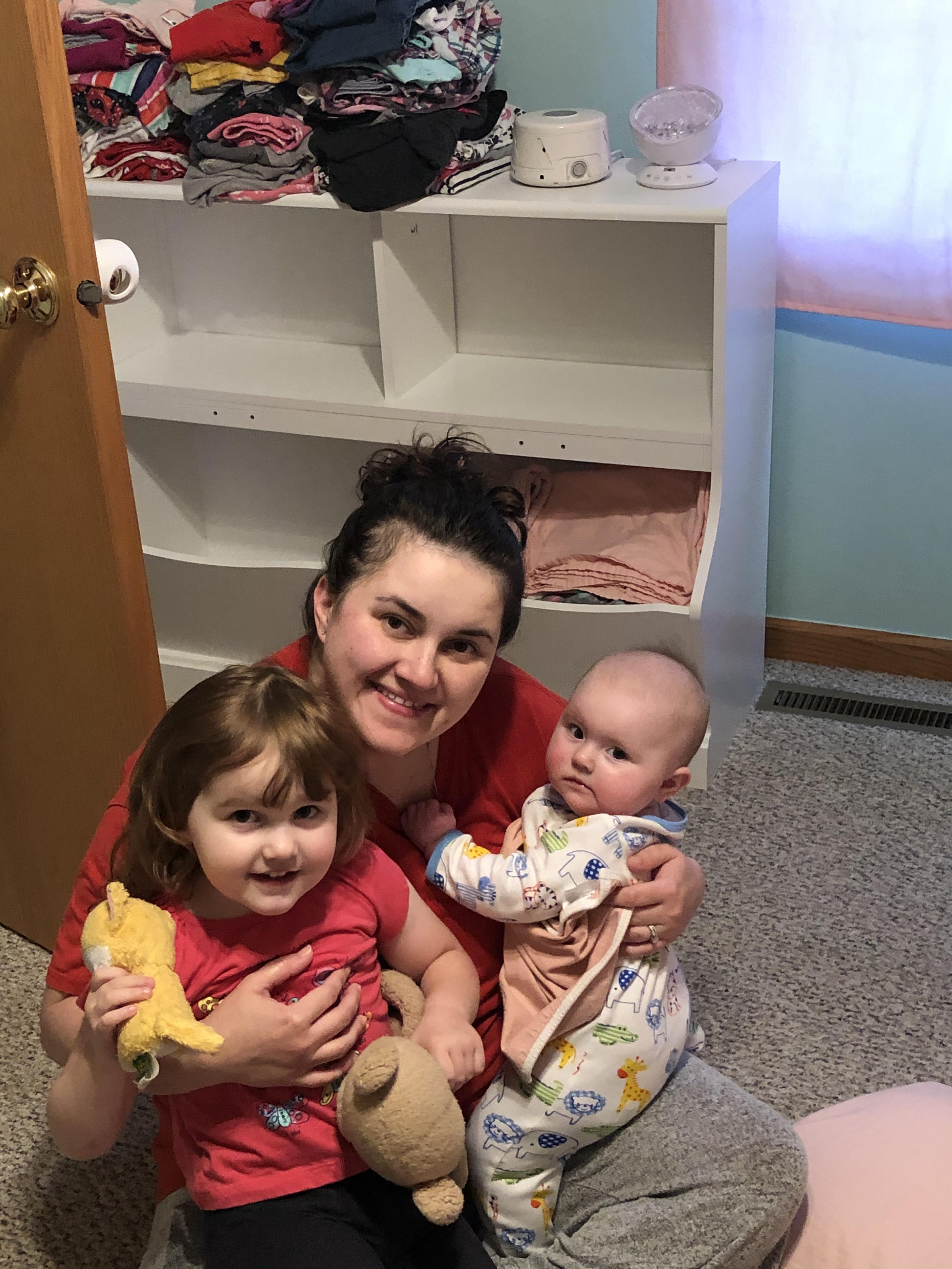 Watercolor portrait of a mother and her two young children.