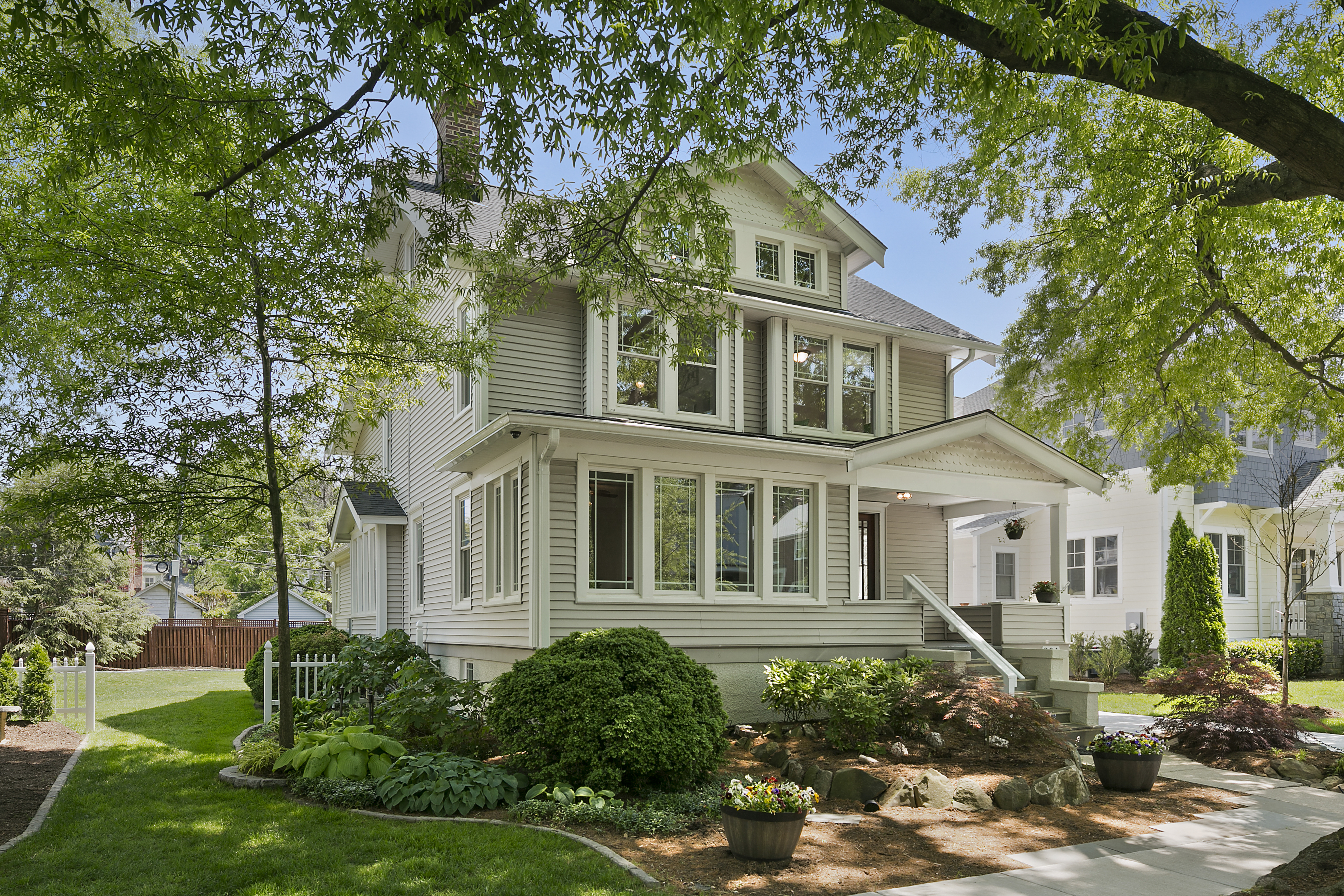 Watercolor painting of a brick two-story house with a porch and a black fence.