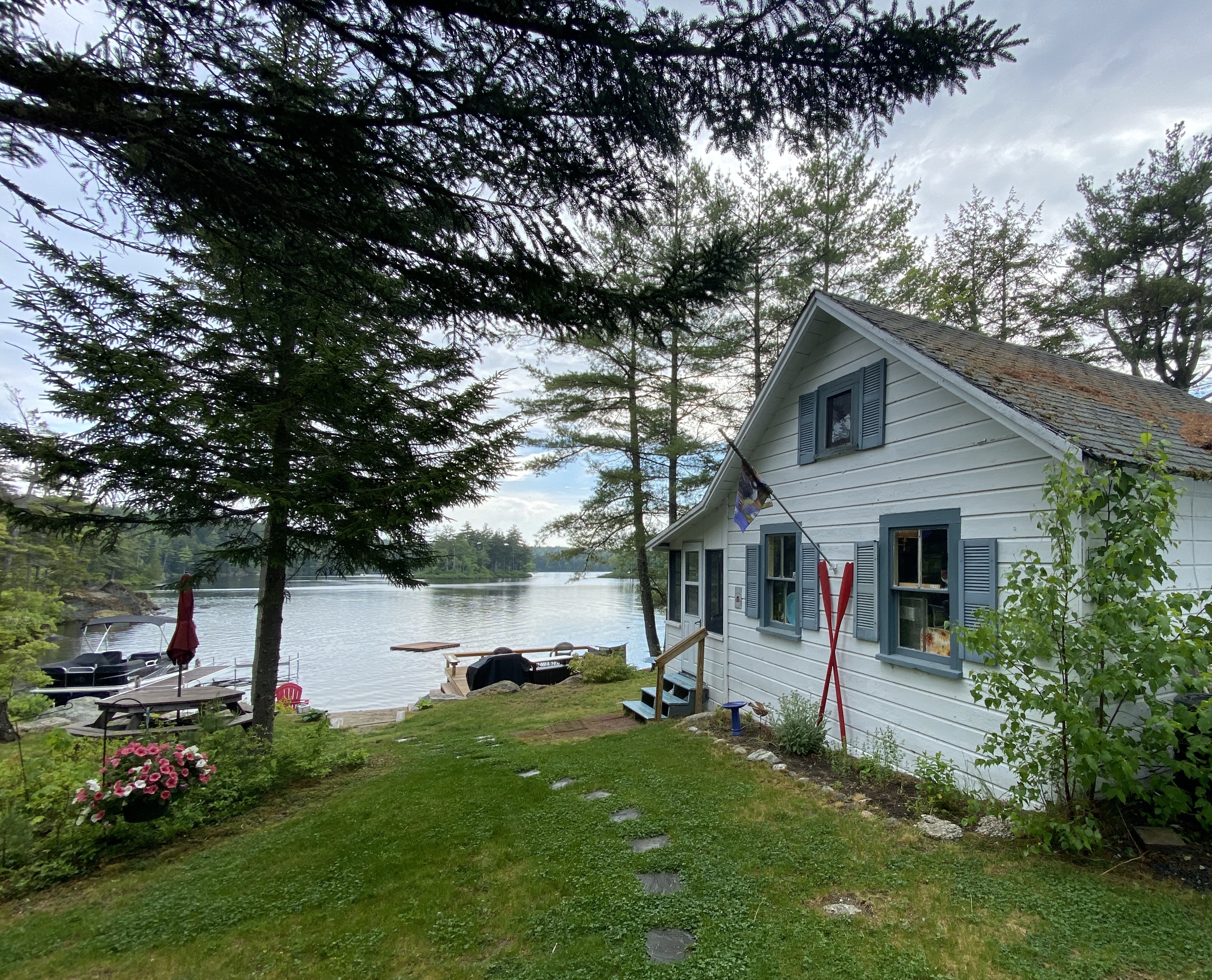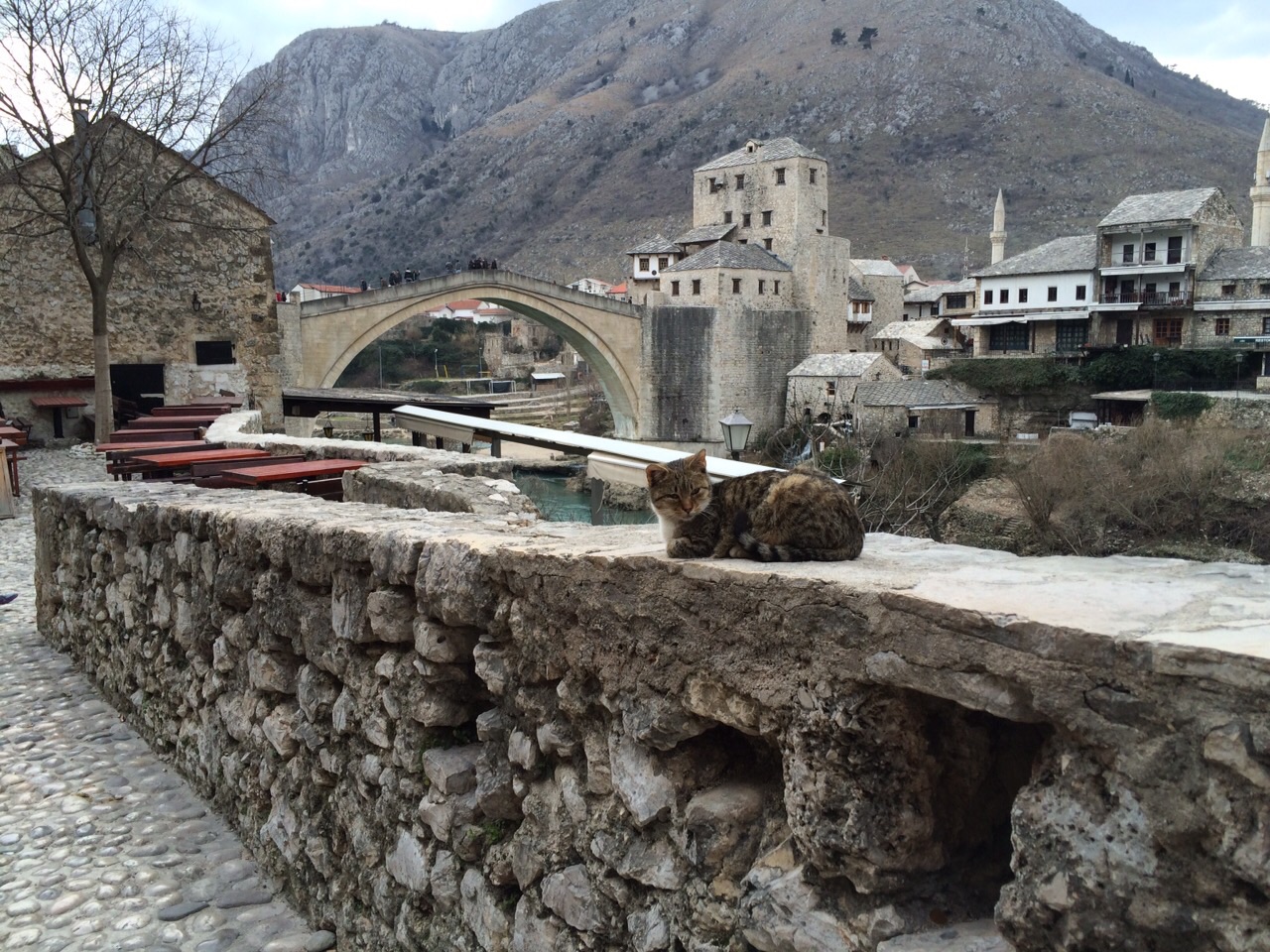 Snow-covered town viewed from above, framed by bare tree branches, mountains in the background.