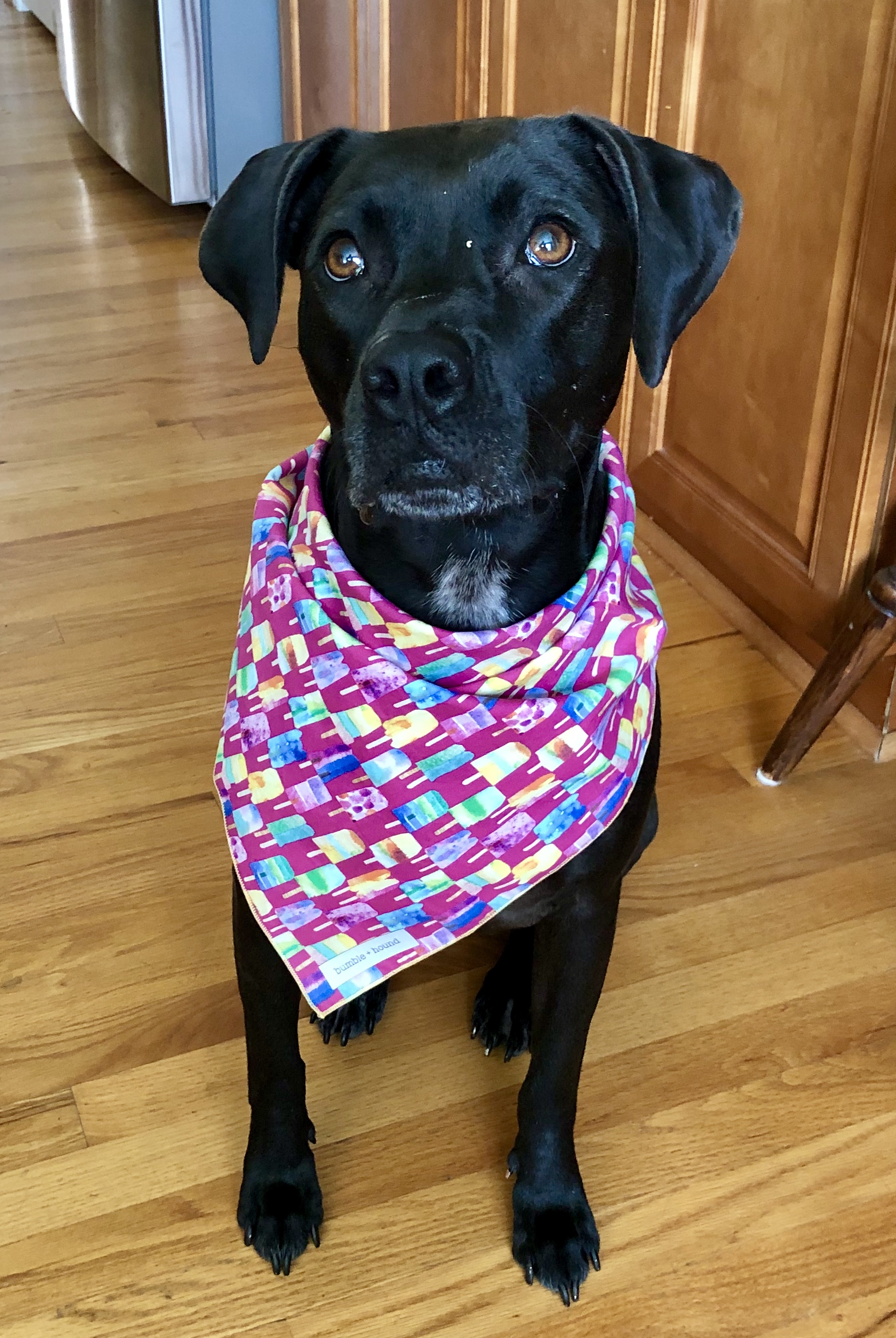 Watercolor painting of a black dog wearing a multicolored bandana.