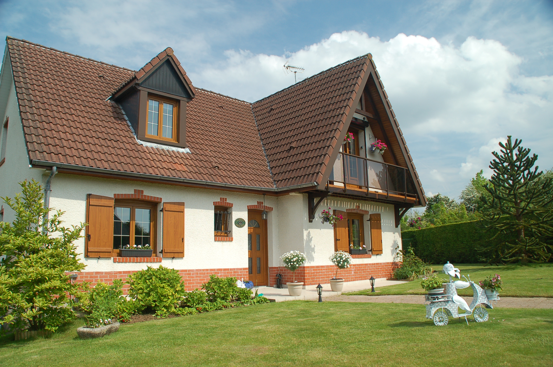 Watercolor painting of a white house with a red tile roof, a brick wall, and a wooden gate.