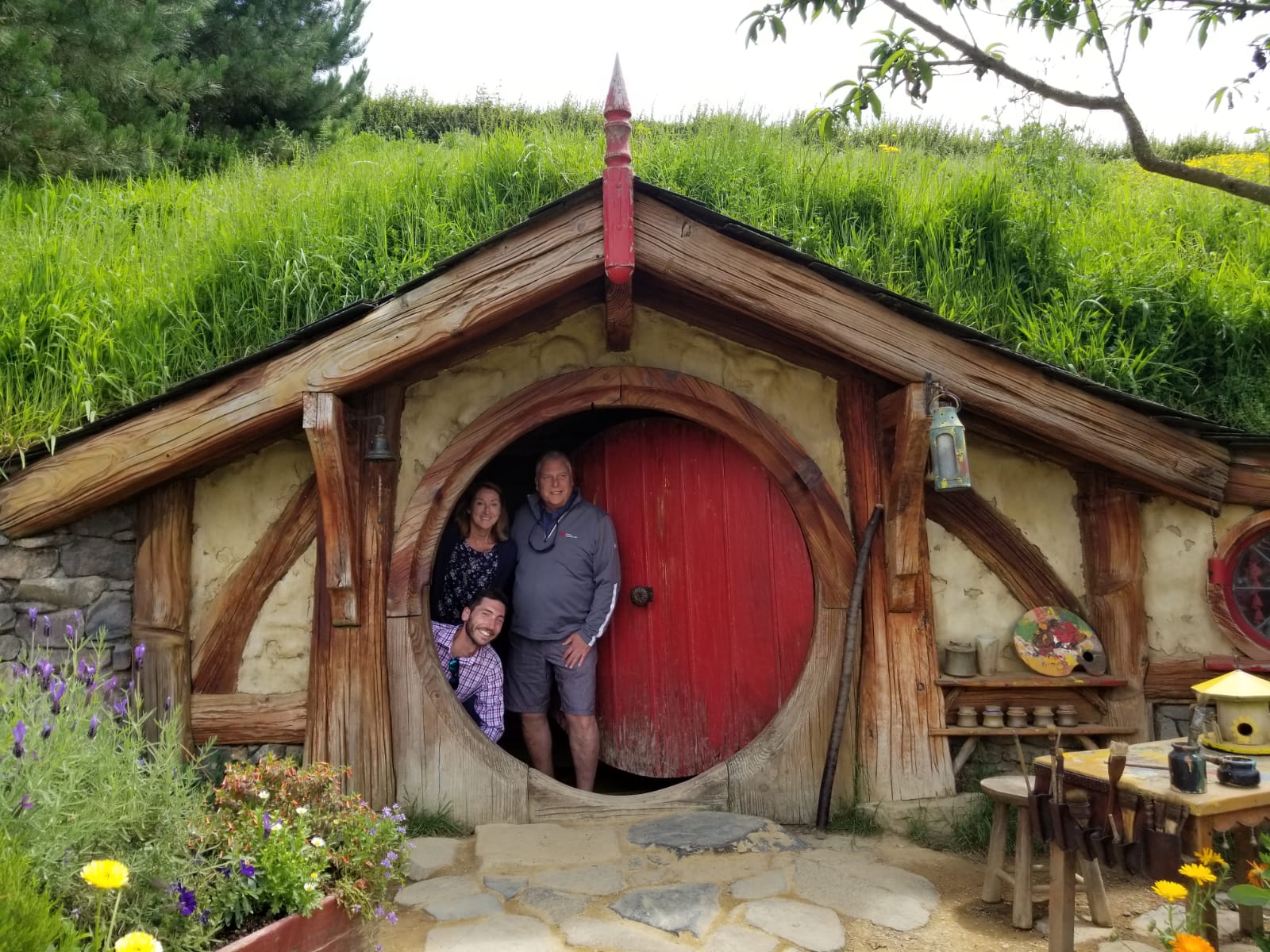 Watercolor portrait of a family of three in front of a quaint watermill and stone bridge.