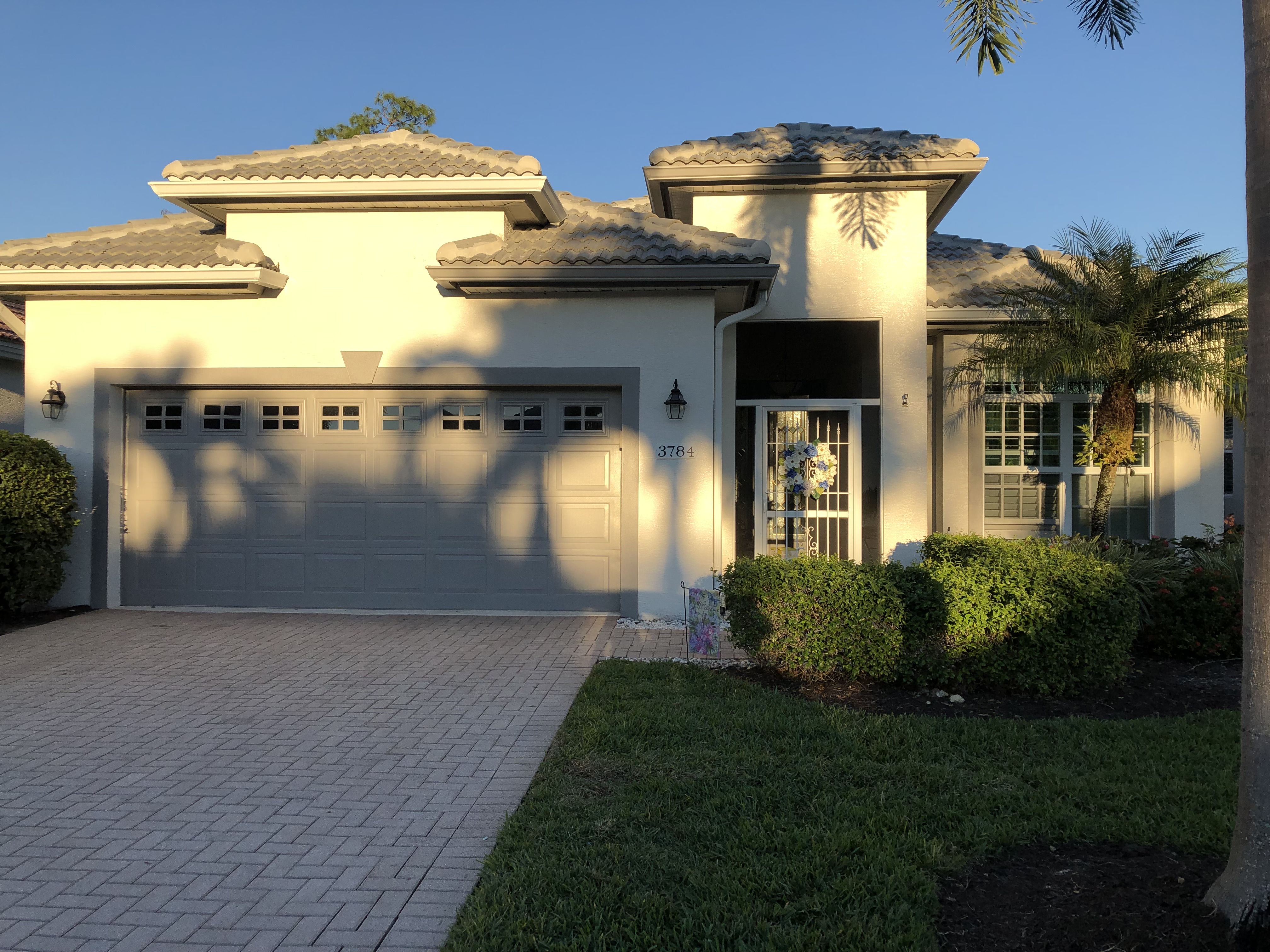 Watercolor painting of a white house with a gray garage door and a wreath on the front door.