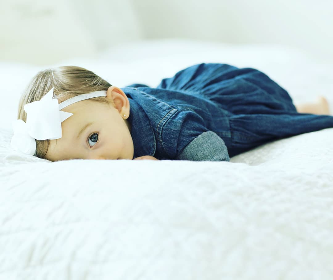 Watercolor painting of a baby girl lying on her stomach in a blue dress.