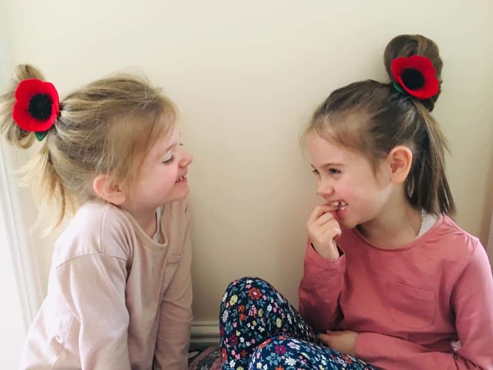 Watercolor painting of two girls with poppy hair clips, smiling at each other.