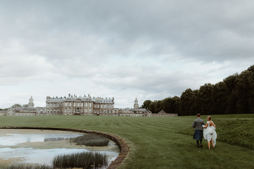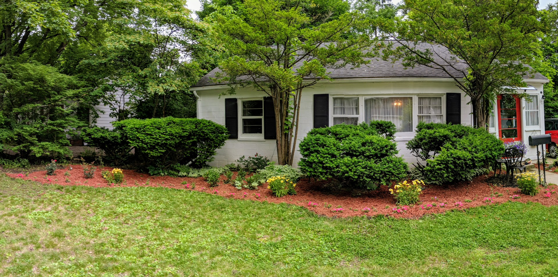 Watercolor painting of a white house with black shutters, surrounded by lush green landscaping.