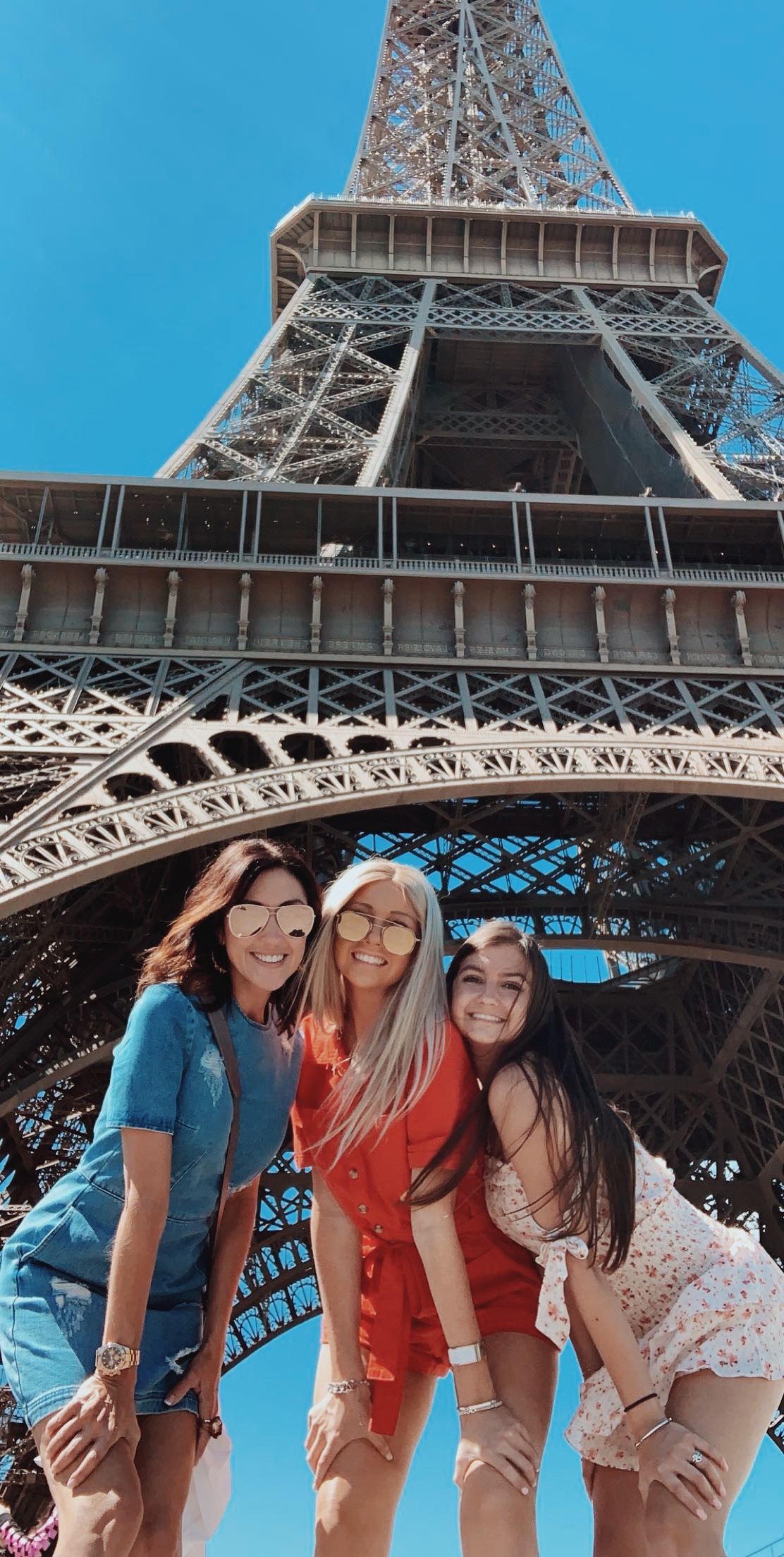 Watercolor painting of three women posing under the Eiffel Tower.