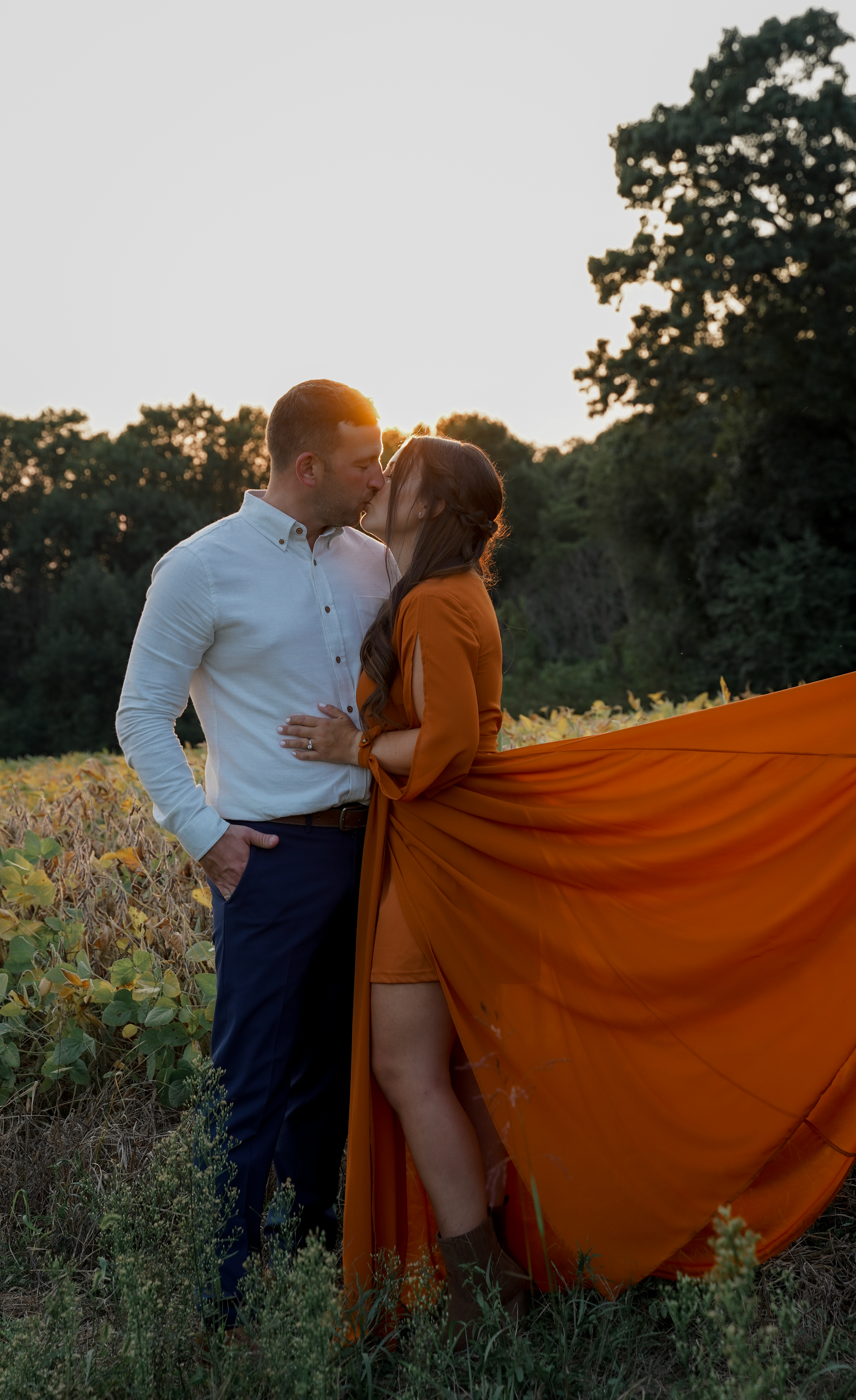 Watercolor painting of a couple kissing outdoors.