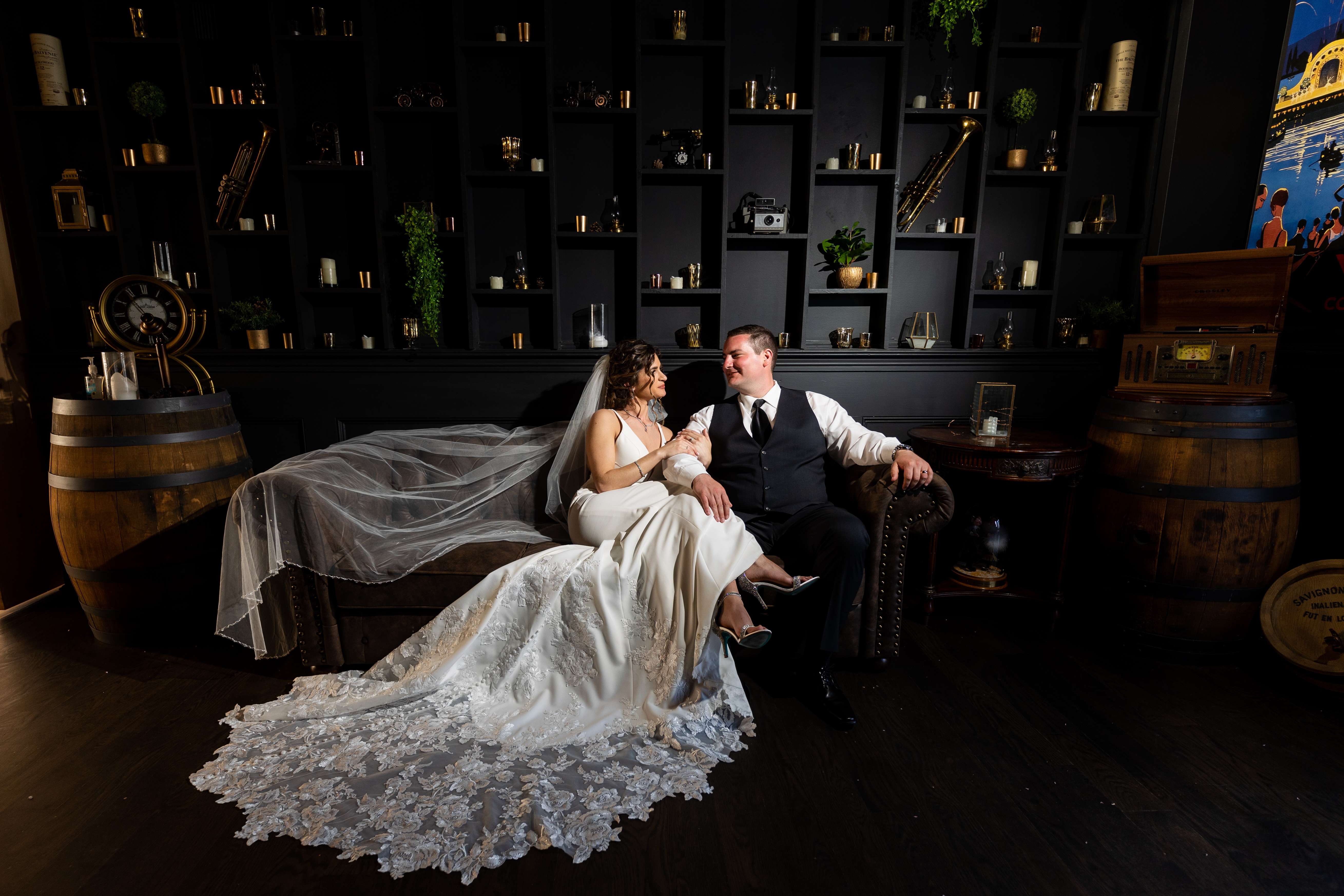 Painting of a bride and groom sitting on a couch in a dimly lit room with shelves behind them.