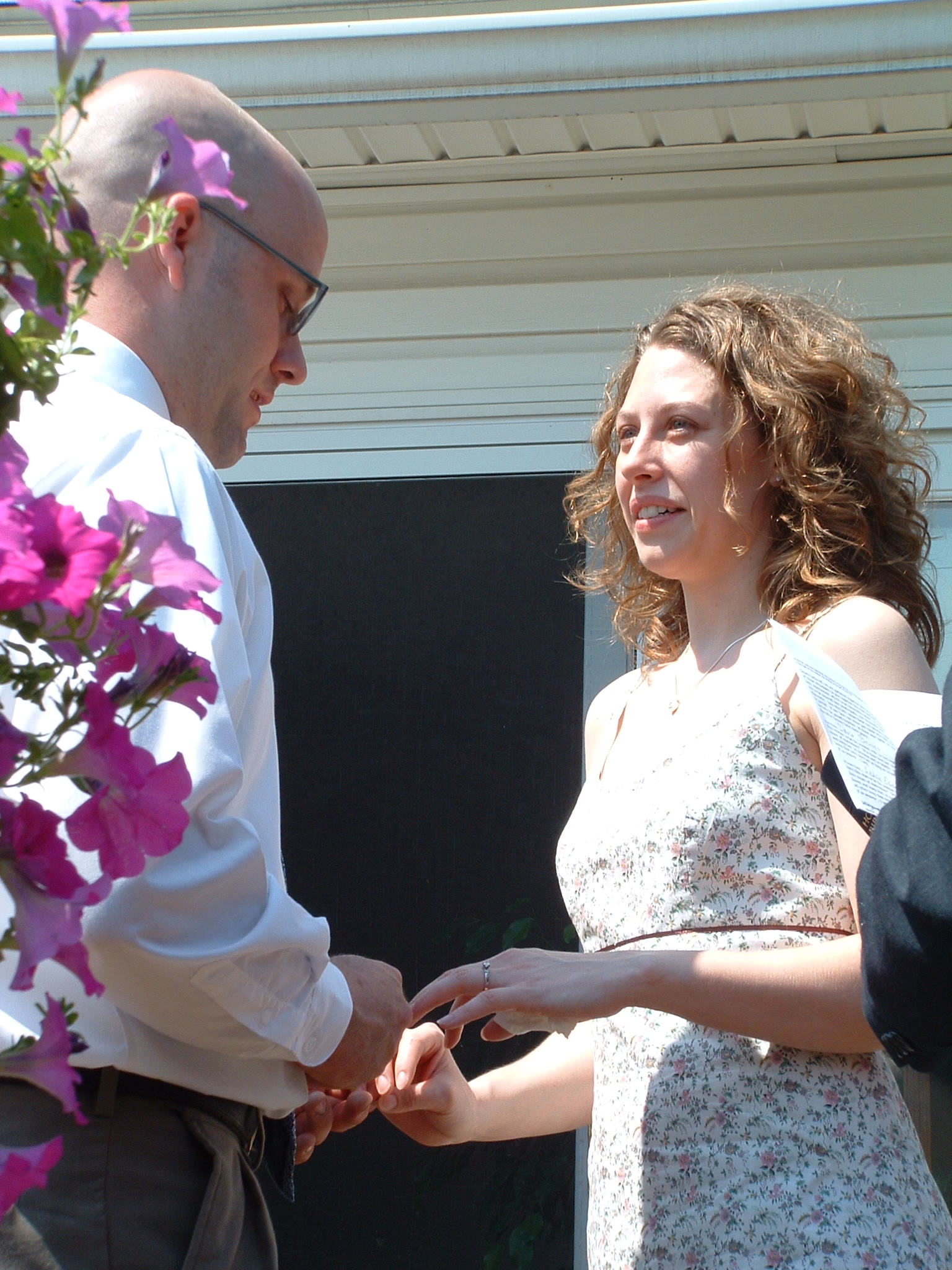 Colored pencil portrait of a bald man in glasses and a woman with curly brown hair, surrounded by flowers.