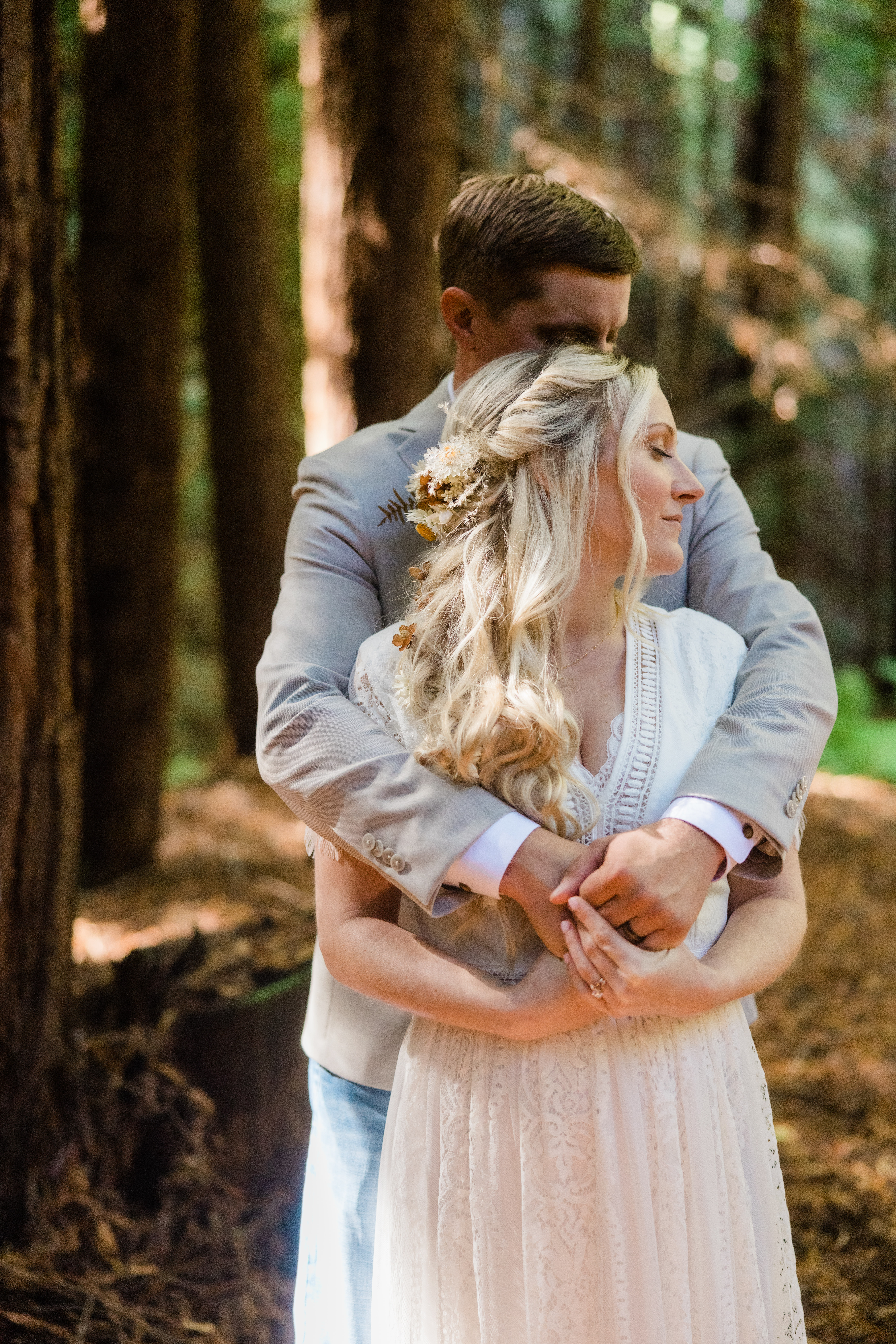 Oil painting of a couple embracing in a forest.