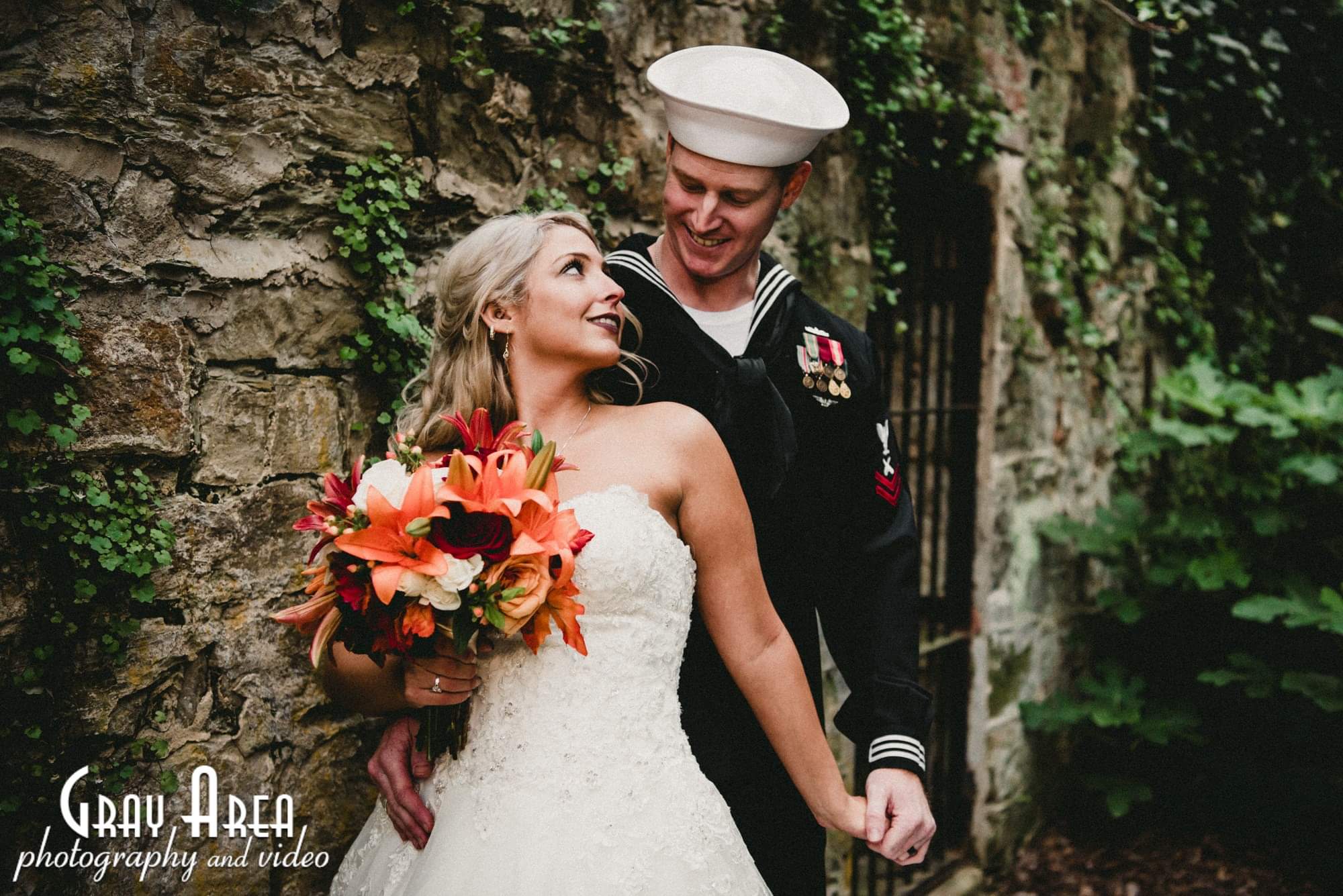 Pastel portrait of a bride and groom, he is in a navy uniform.