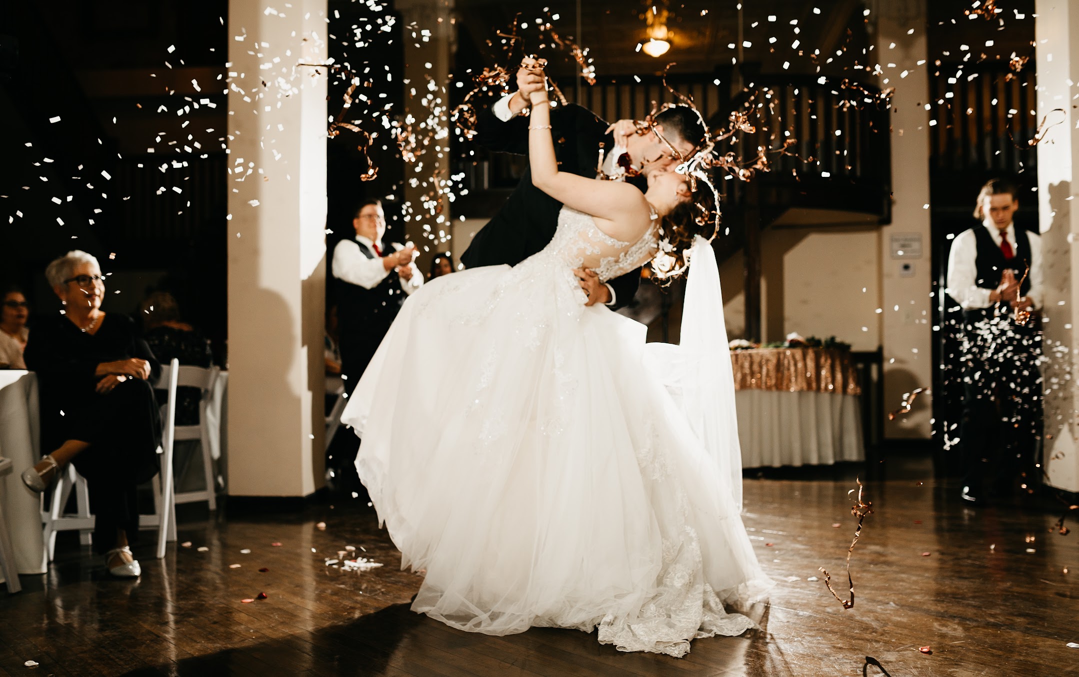 Wedding portrait collage showing the couple at various moments throughout their day, including with wedding party and fireworks.
