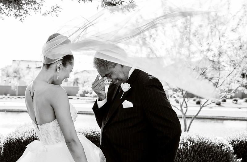 Black and white painting of a bride and groom on their wedding day, the bride is laughing and the groom is wiping a tear from his eye.