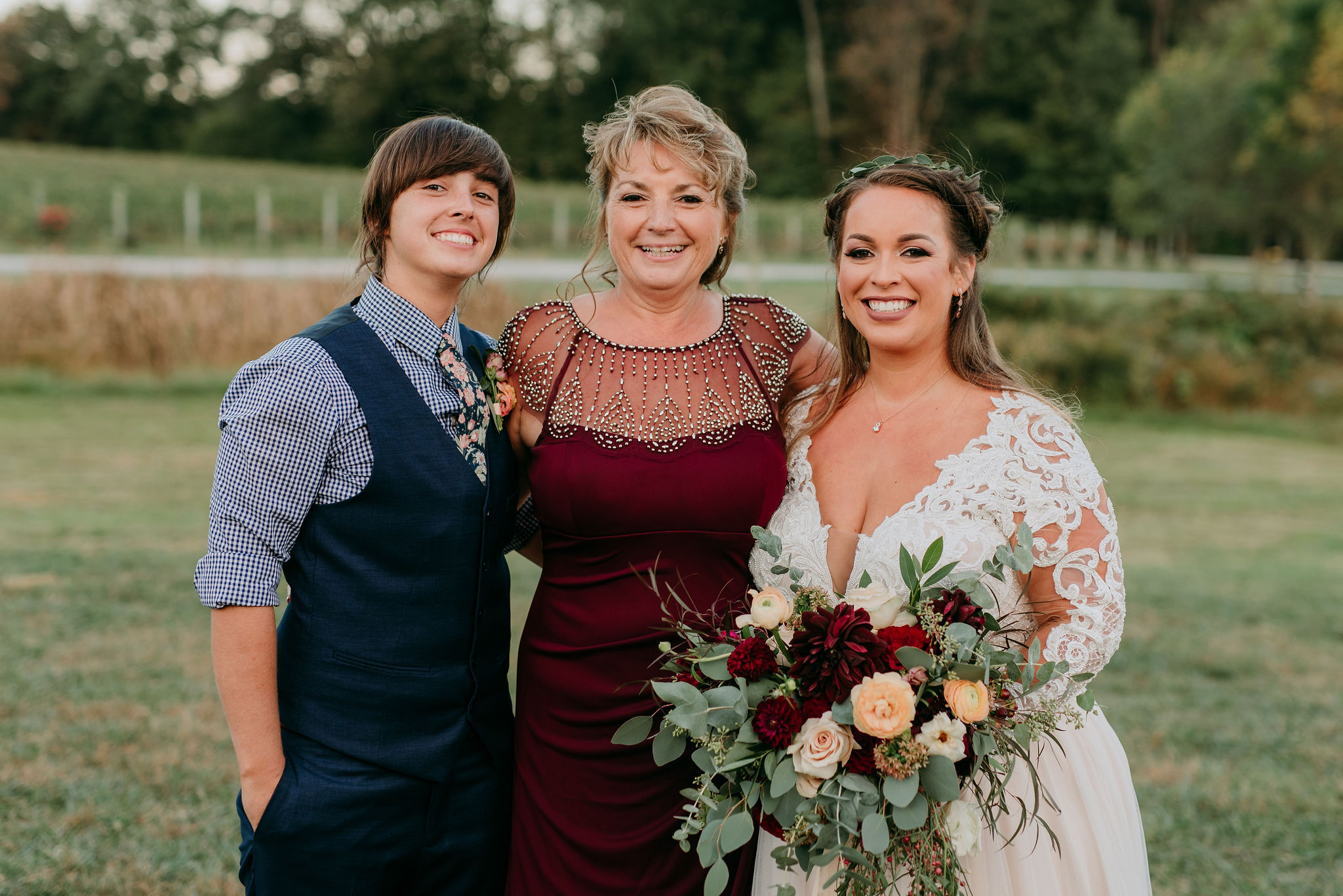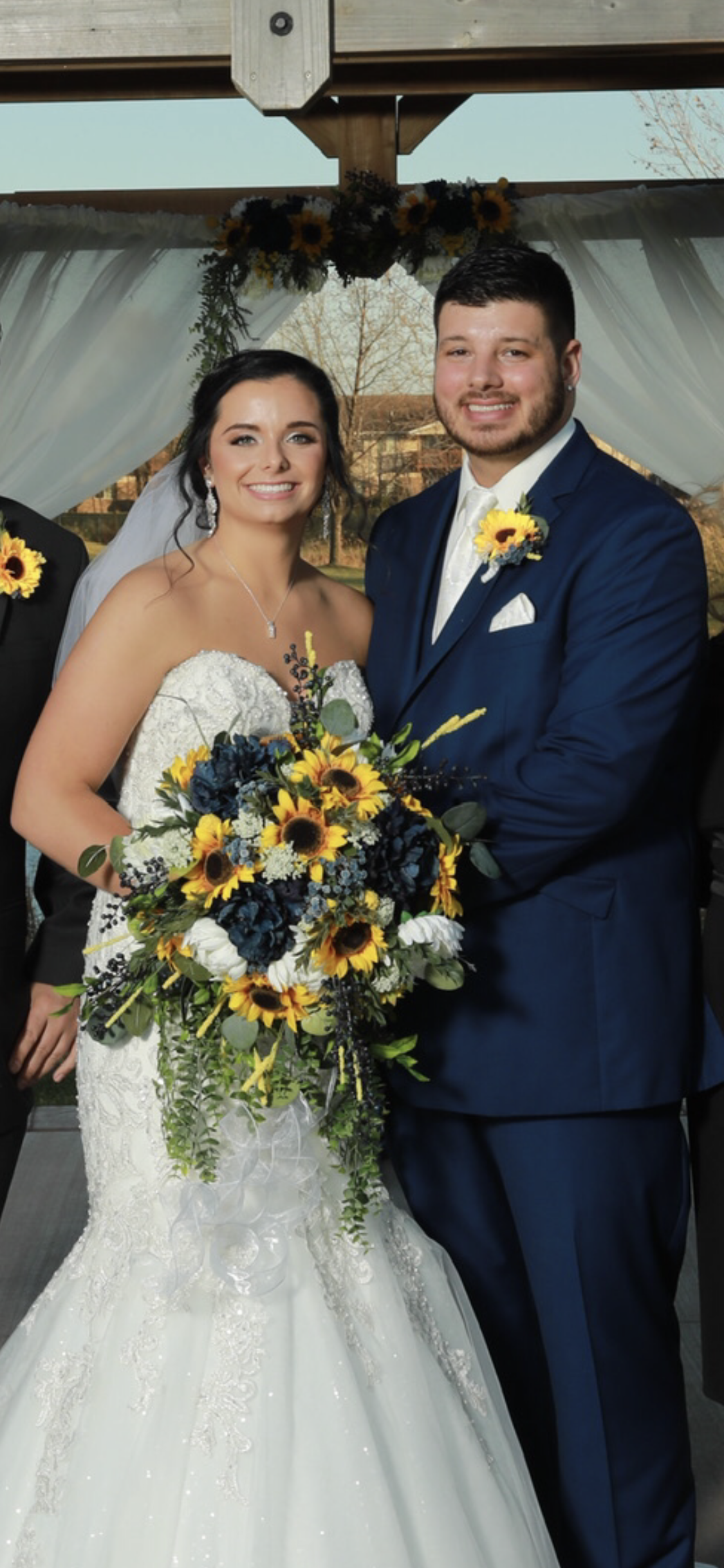 Painted portrait of a bride and two grooms in navy suits, each with a sunflower boutonniere.