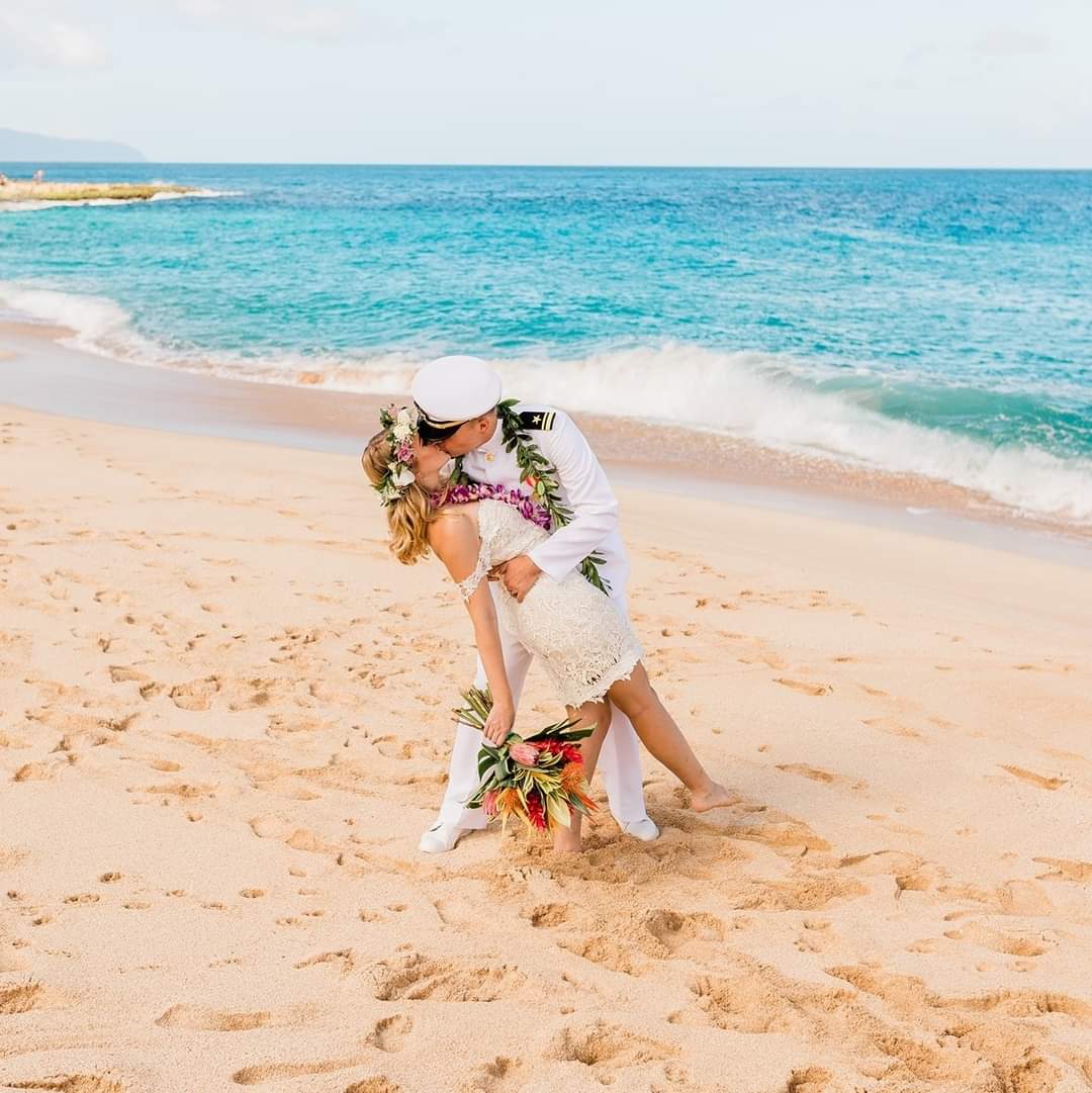 Beach wedding painting, bride and groom kissing.