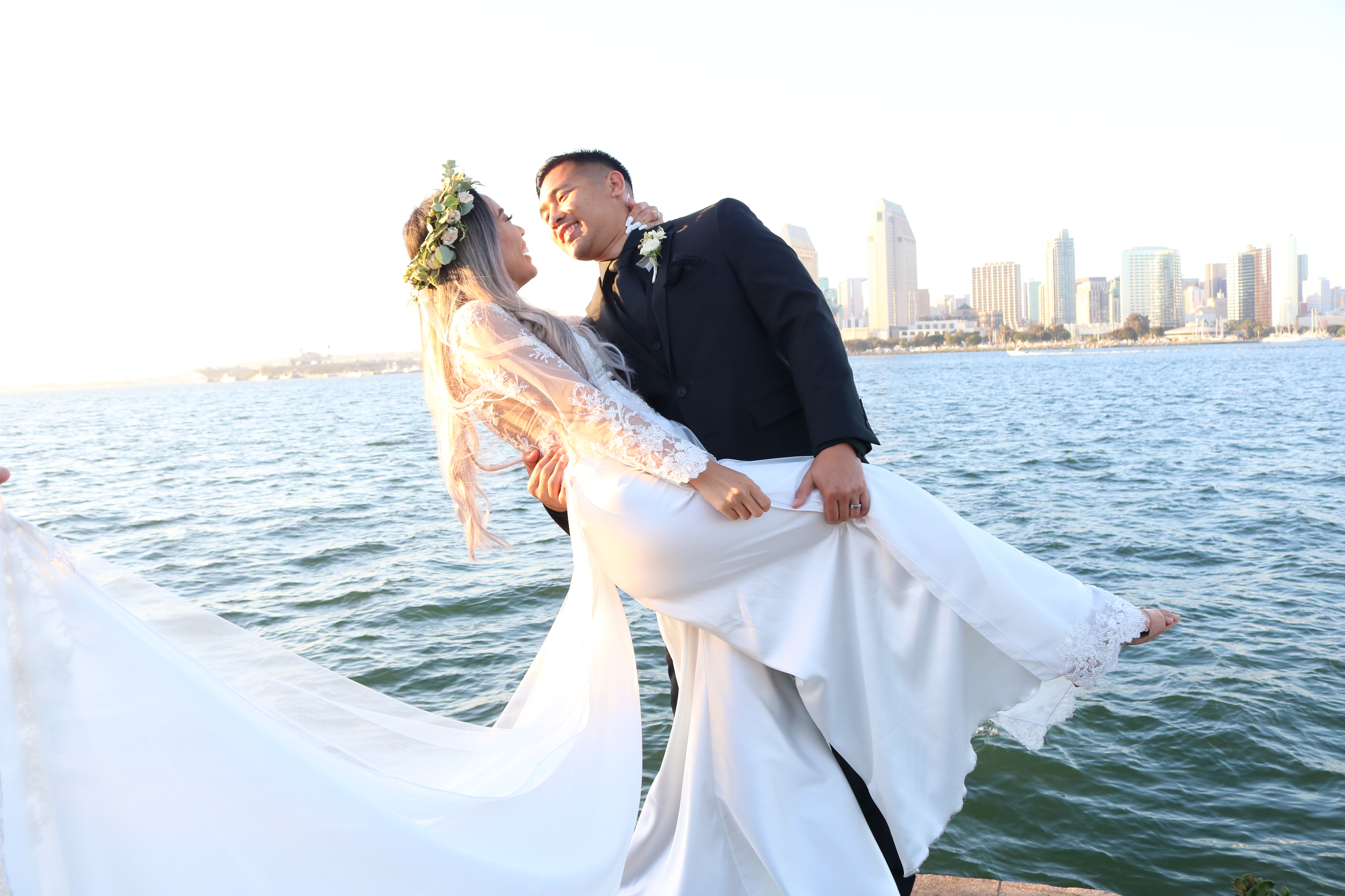 Painting of a groom carrying his bride over water with a city skyline in the background.