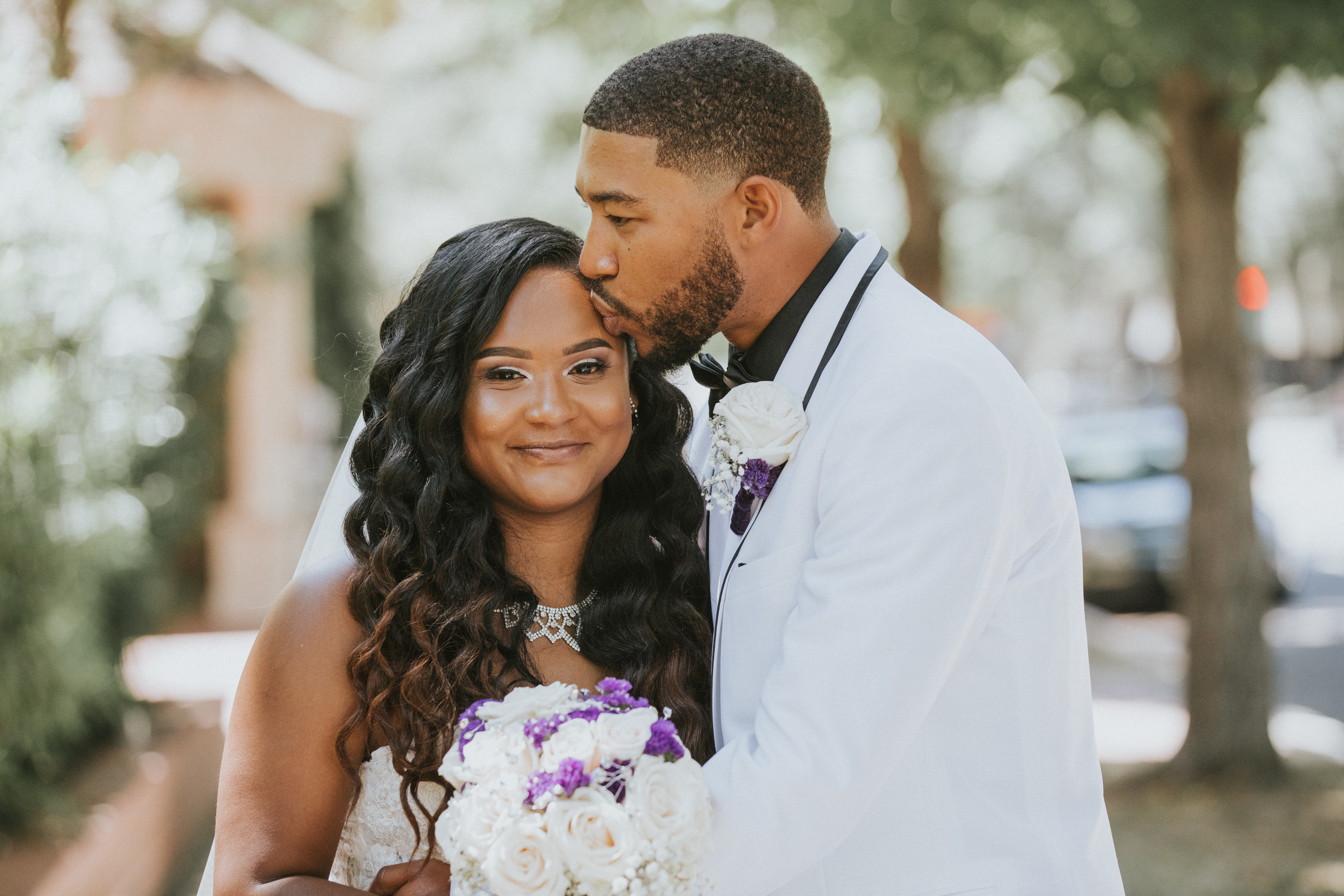 Painting of a bride and groom kissing.