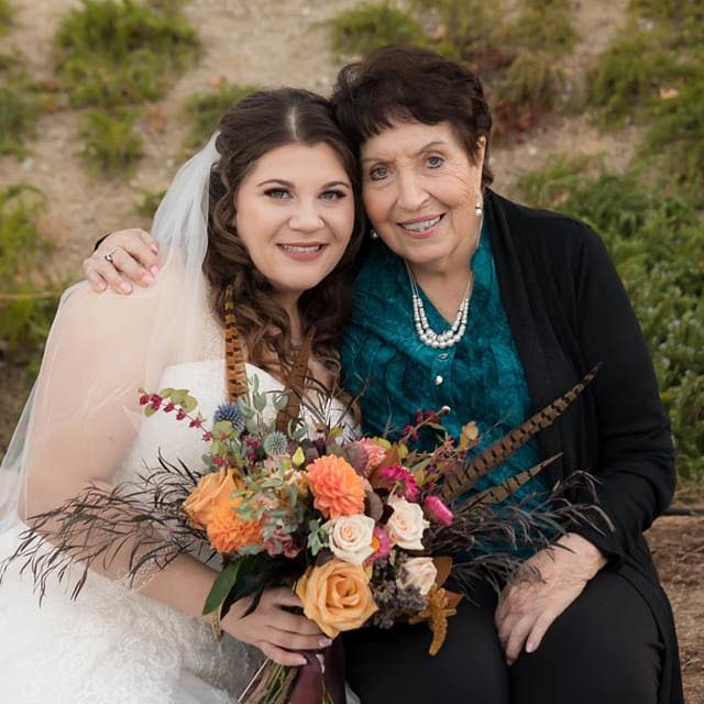 Painting of a bride and an older woman, smiling, in front of a moonlit seascape.