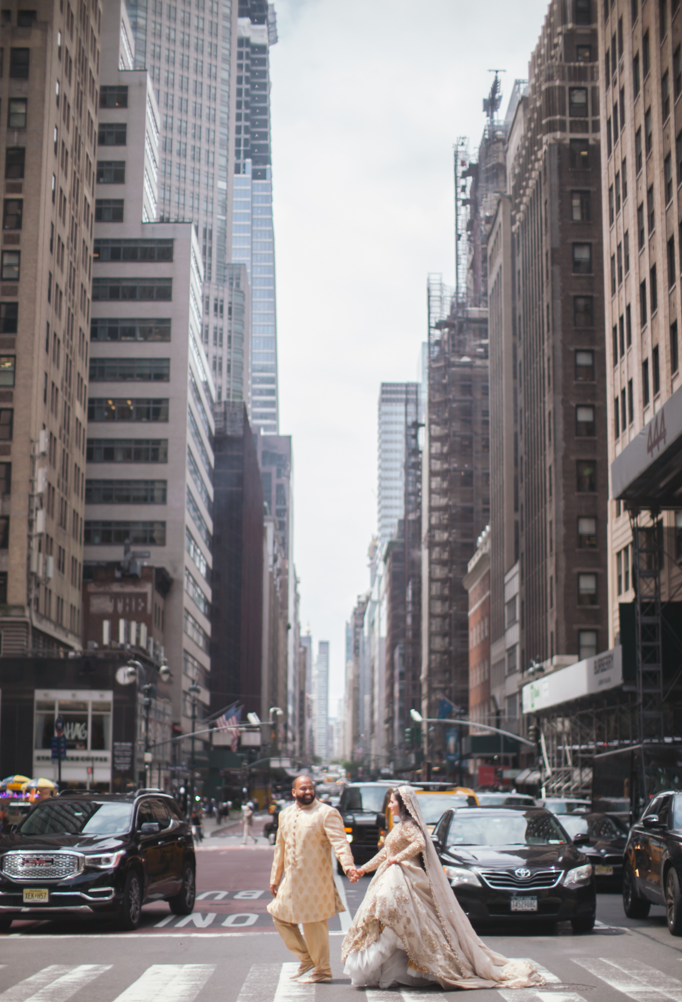 A painting of a bride and groom holding hands and crossing a busy New York City street.