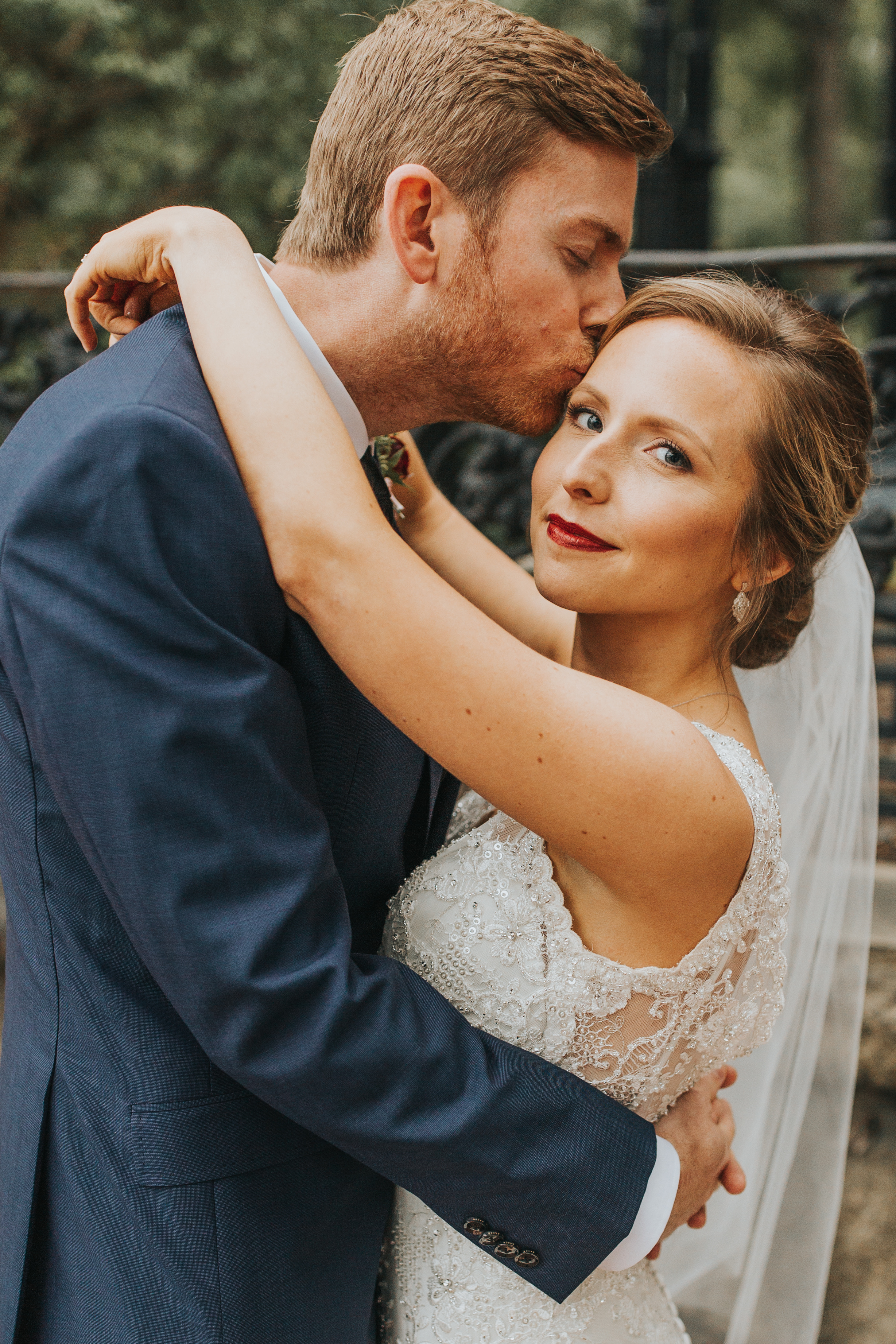 Watercolor painting of a groom kissing a bride on the forehead.