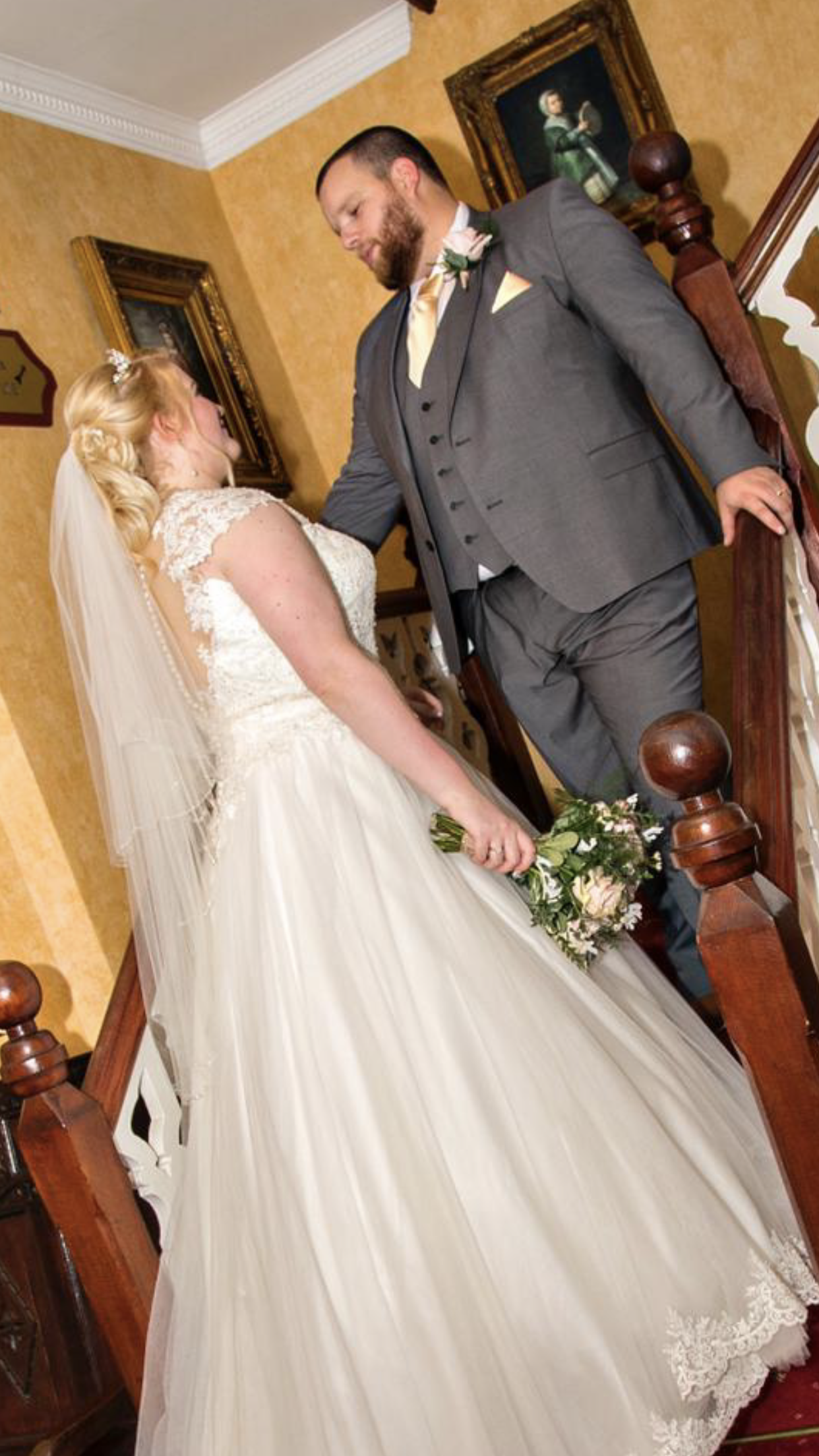 Painting of a bride and groom on a staircase