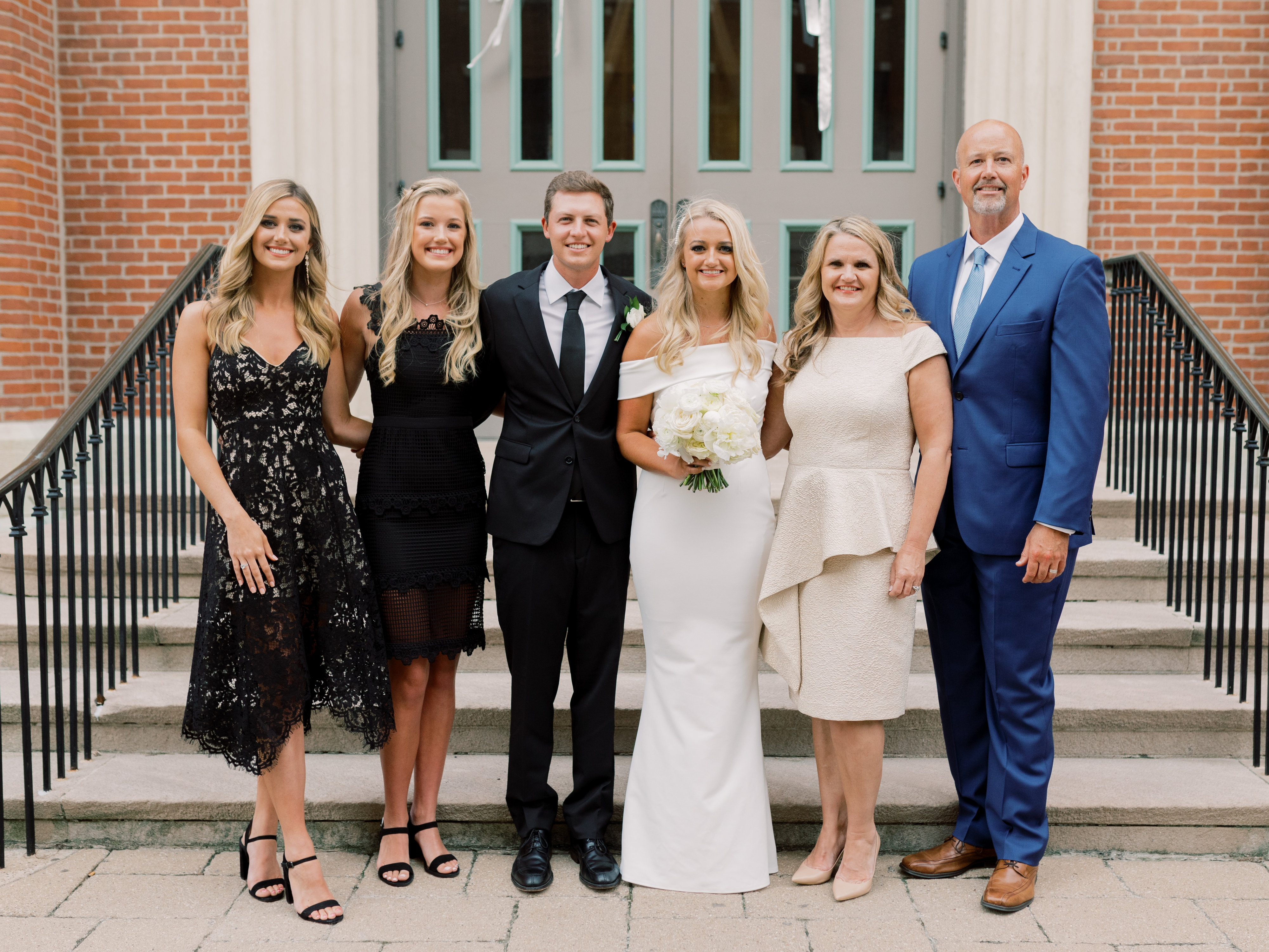 Painted portrait of a large family group on steps, including a bride and groom.