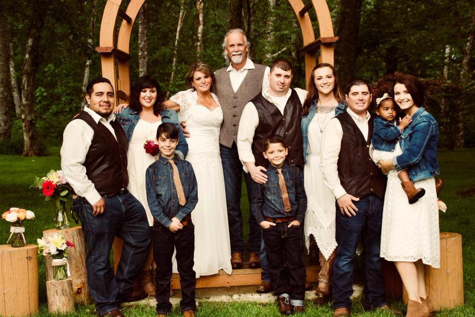 Large family portrait, painted in oils, posed in front of a wooden arbor.