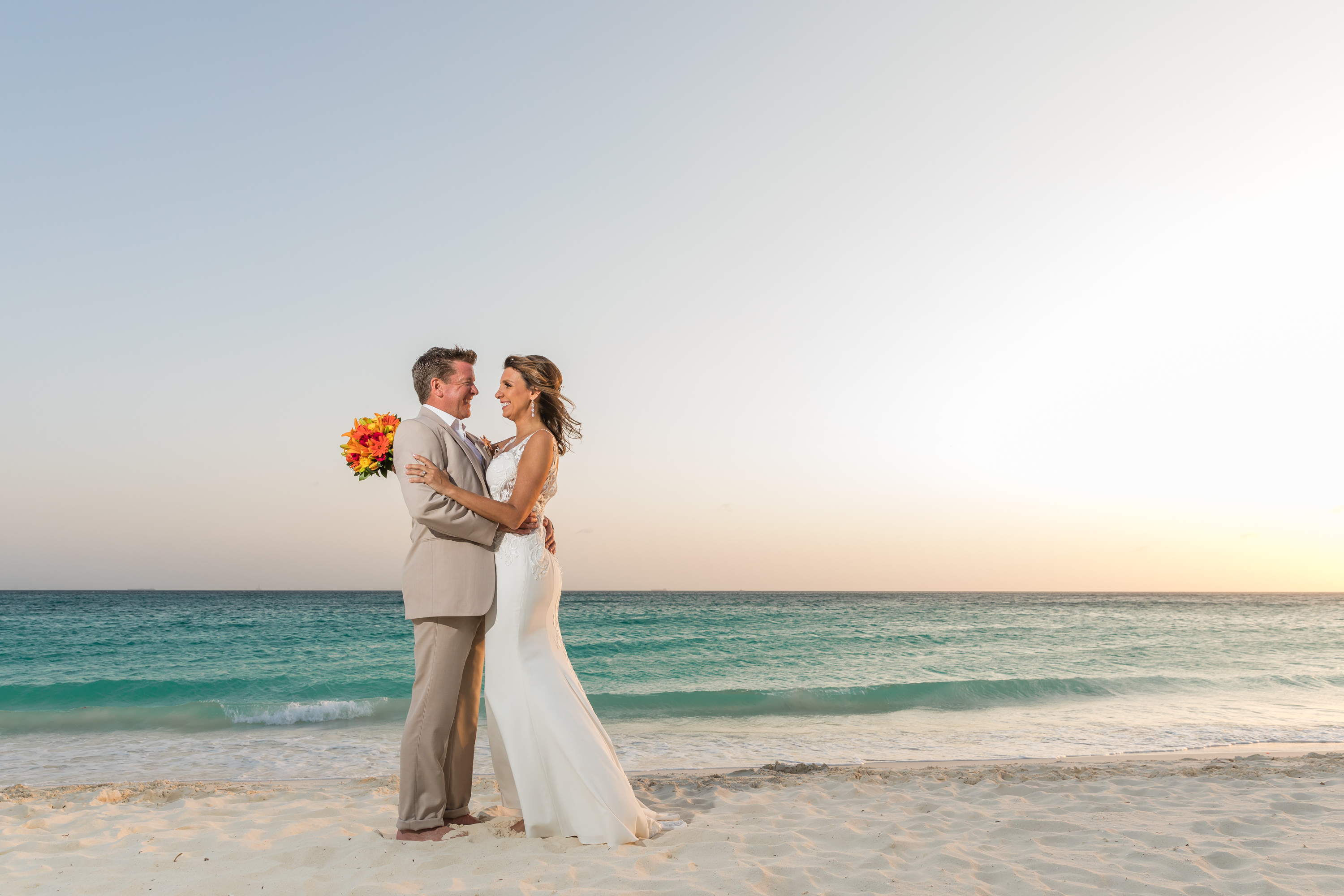 Beach wedding portrait of a couple embracing.