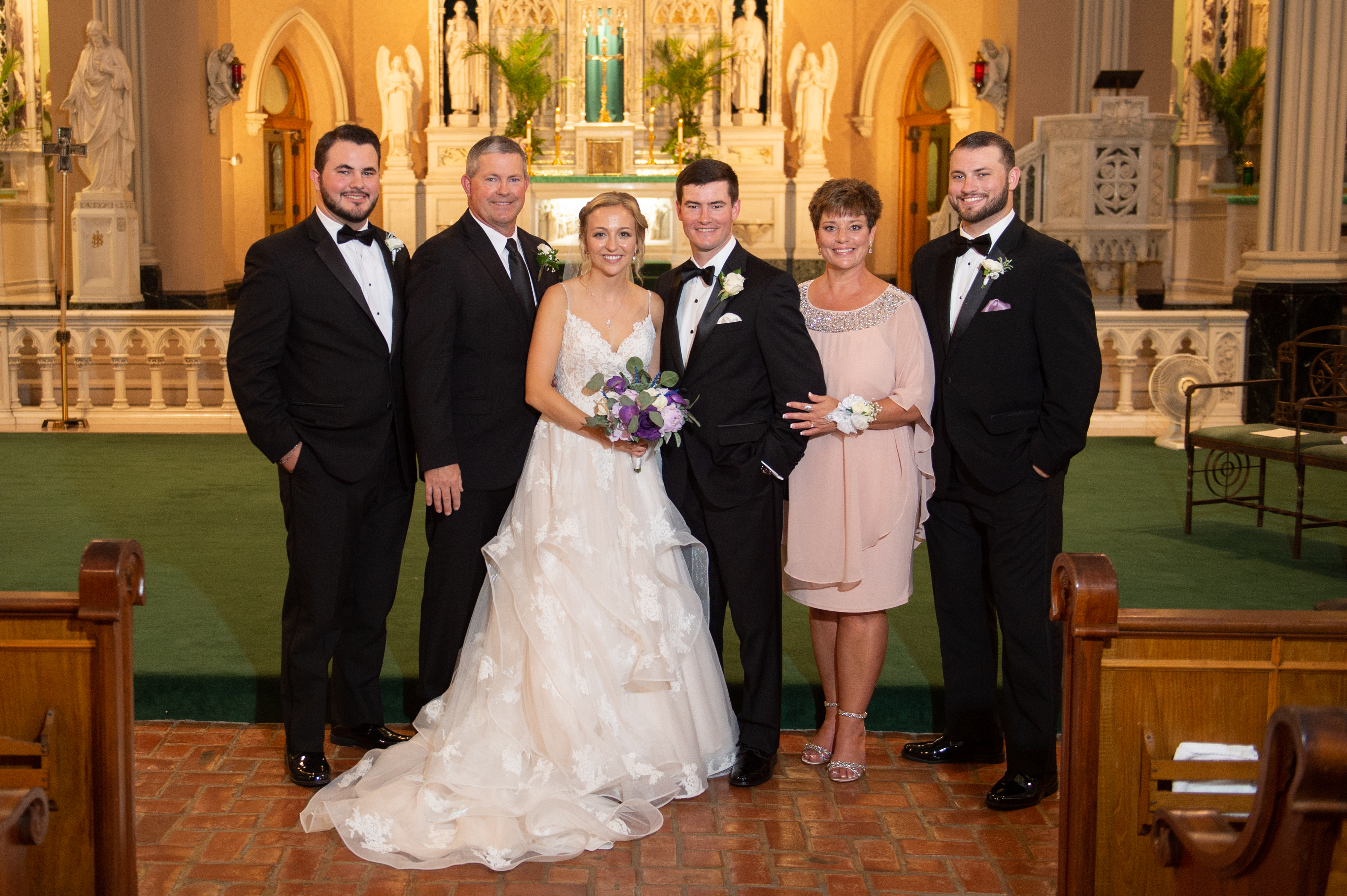 Painted portrait of a bride and groom with their families in a church.