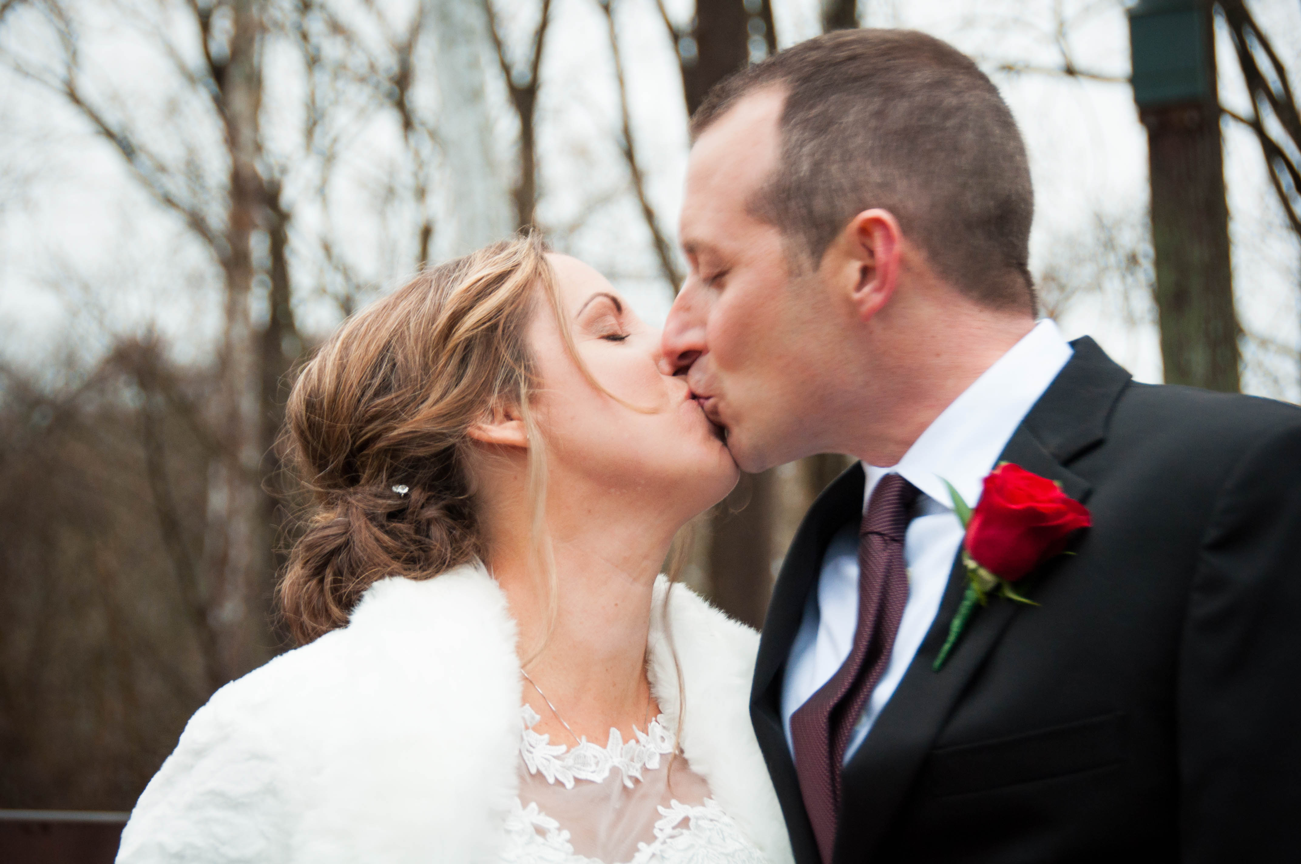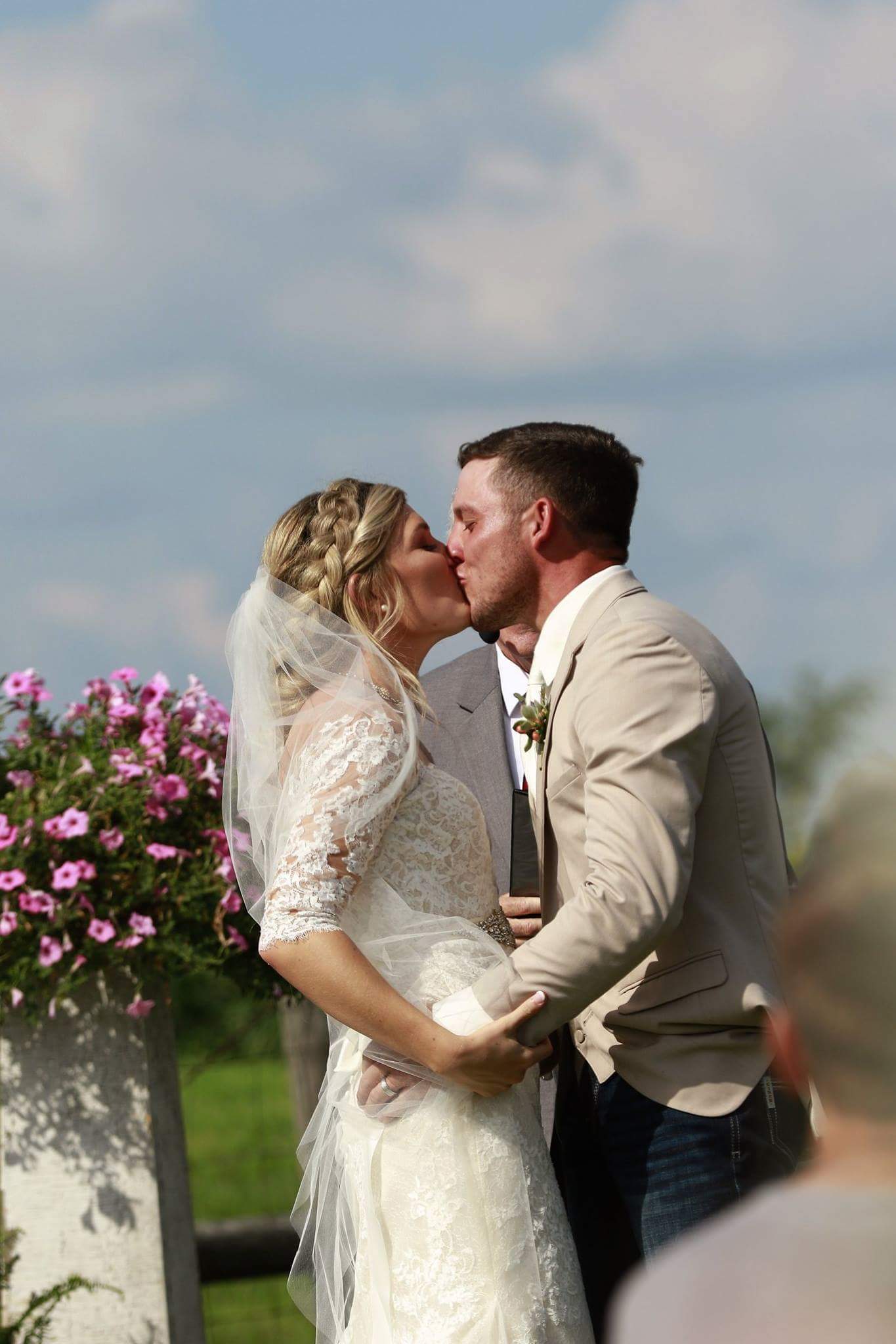 Black and white drawing of a bride and groom kissing.