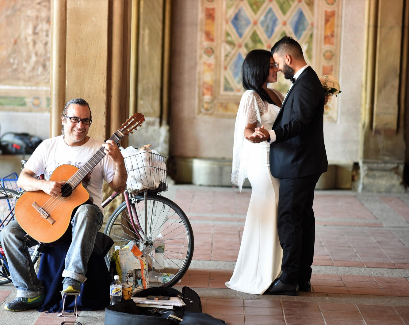 A guitarist sits beside his bicycle, playing while a bride and groom embrace nearby.