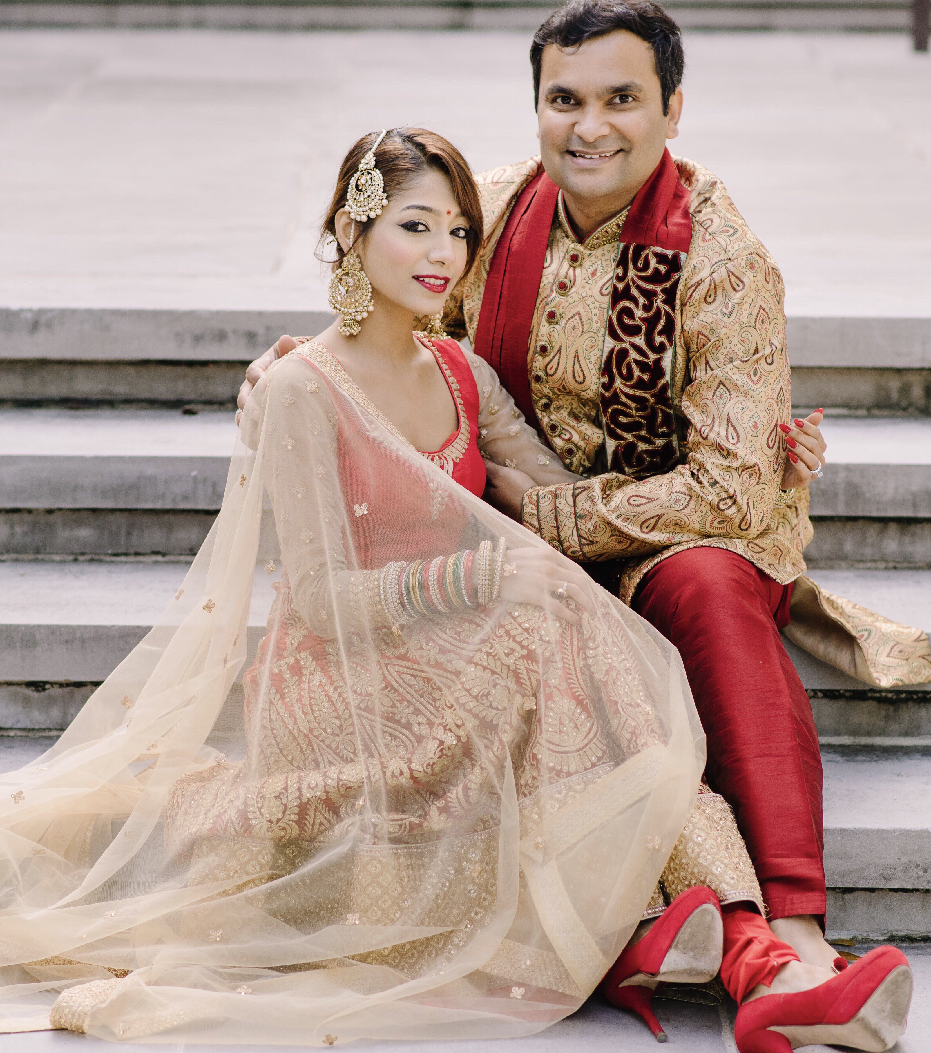 Painting of a couple in traditional South Asian wedding attire sitting on steps.