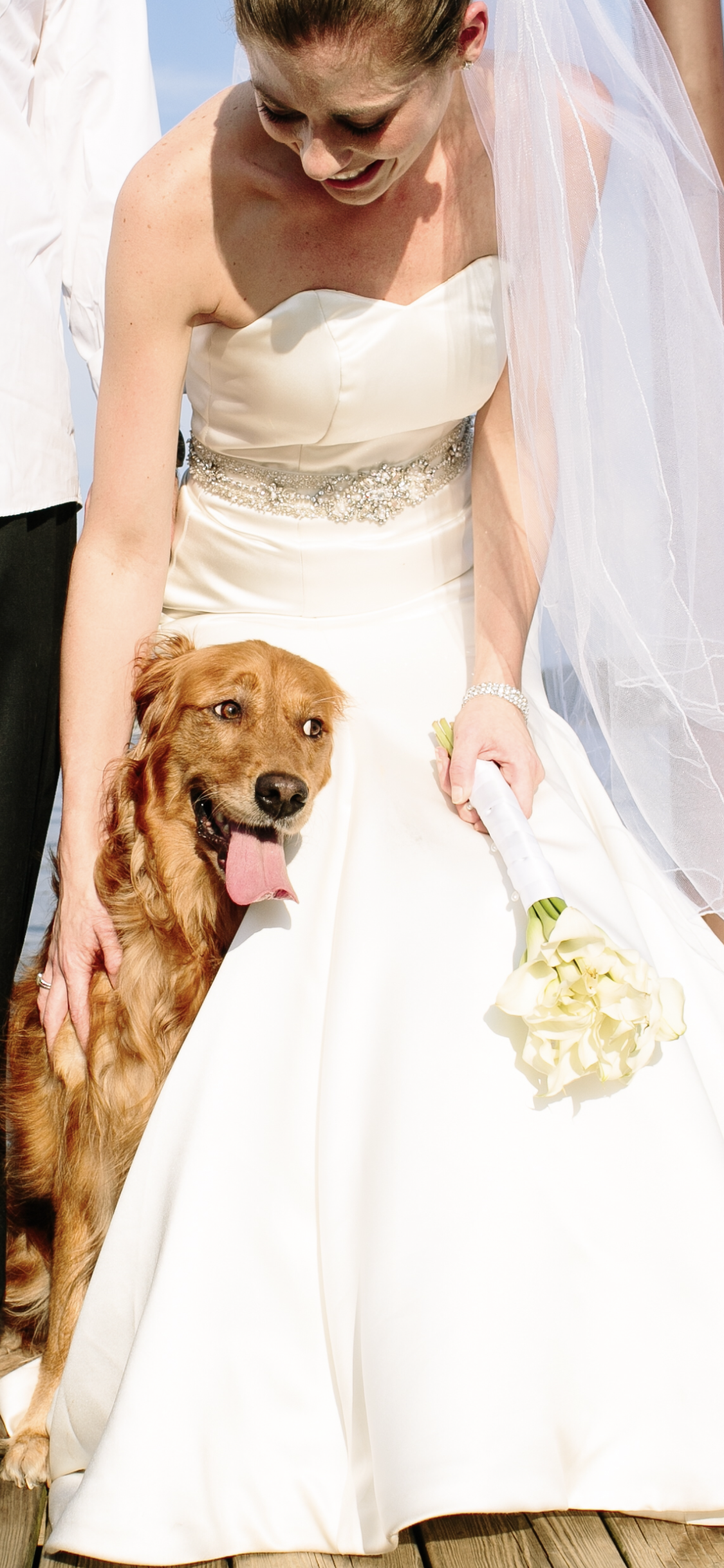 Painting of a bride in a white wedding dress smiling down at a golden retriever sitting at her feet.