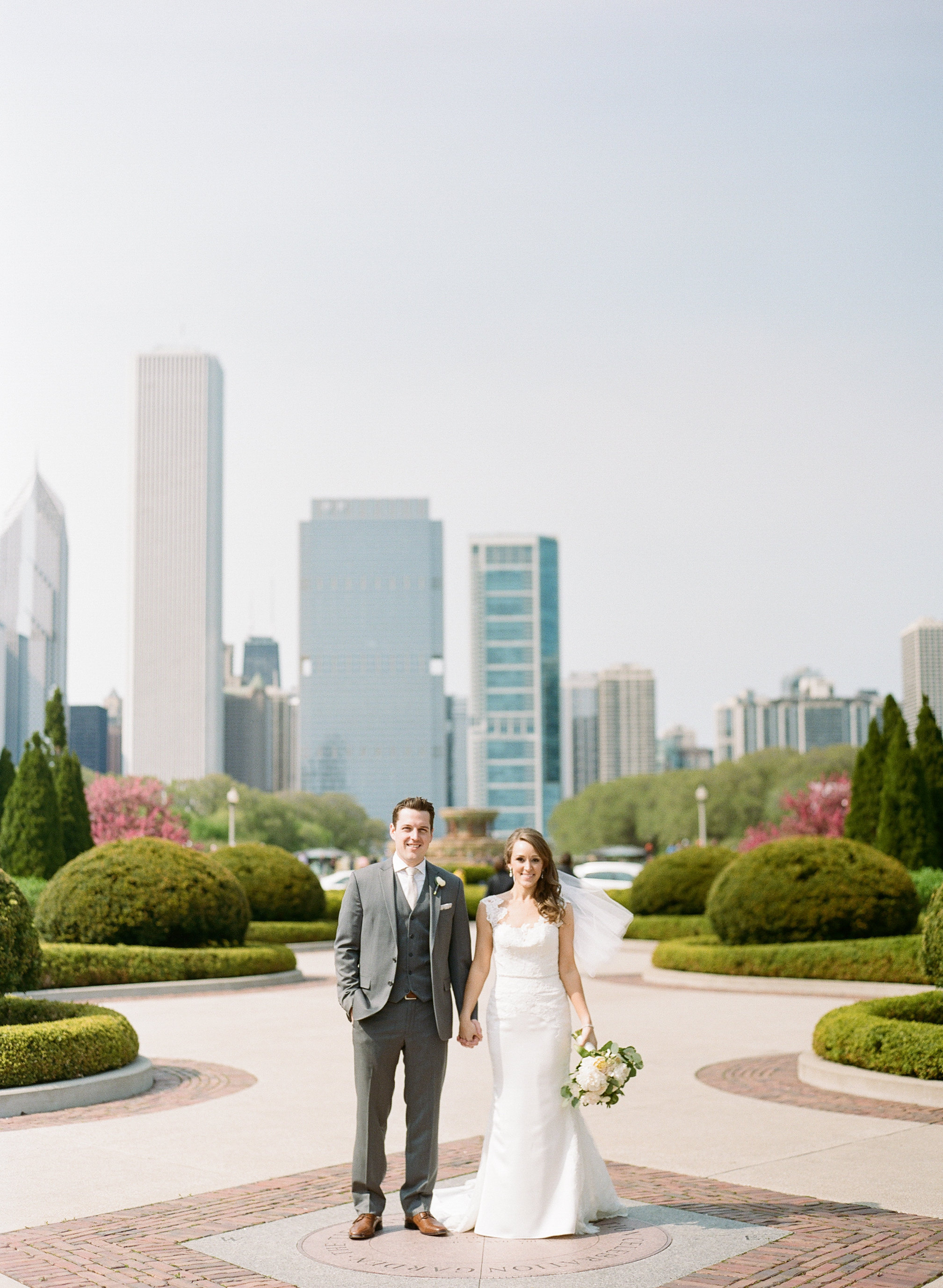 Painting of a bride and groom holding hands, city skyline in background.