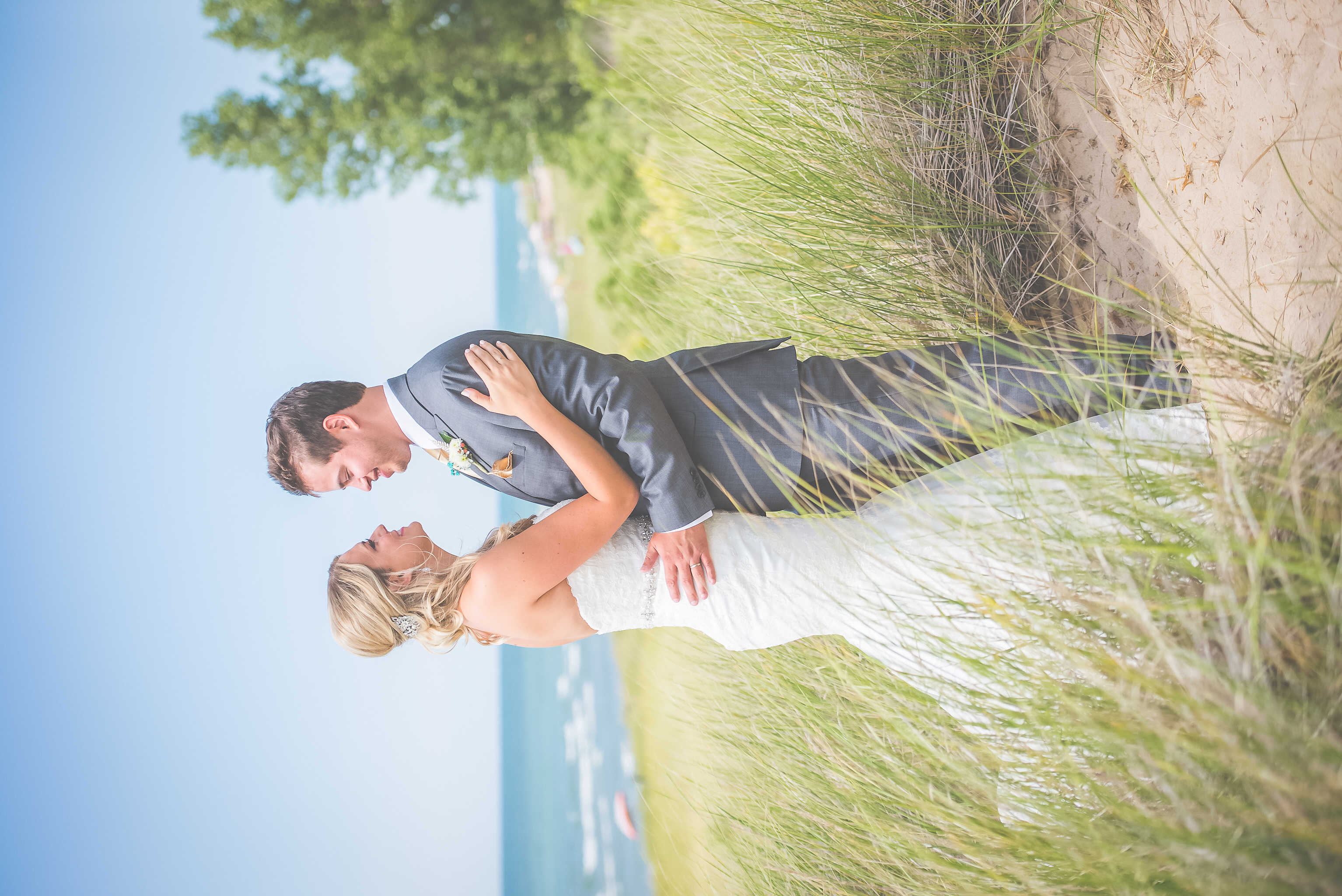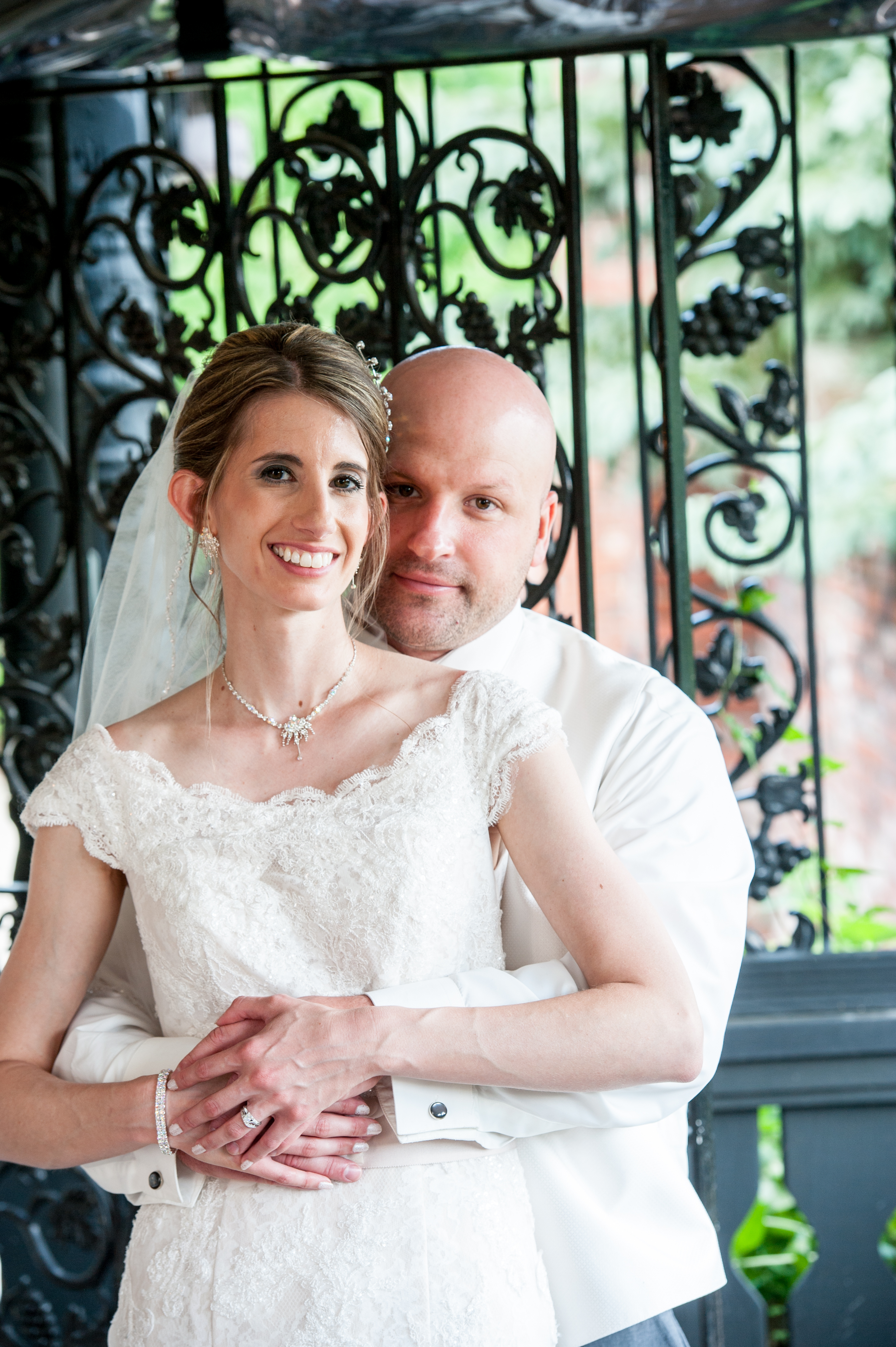 Wedding portrait of bride and groom embracing