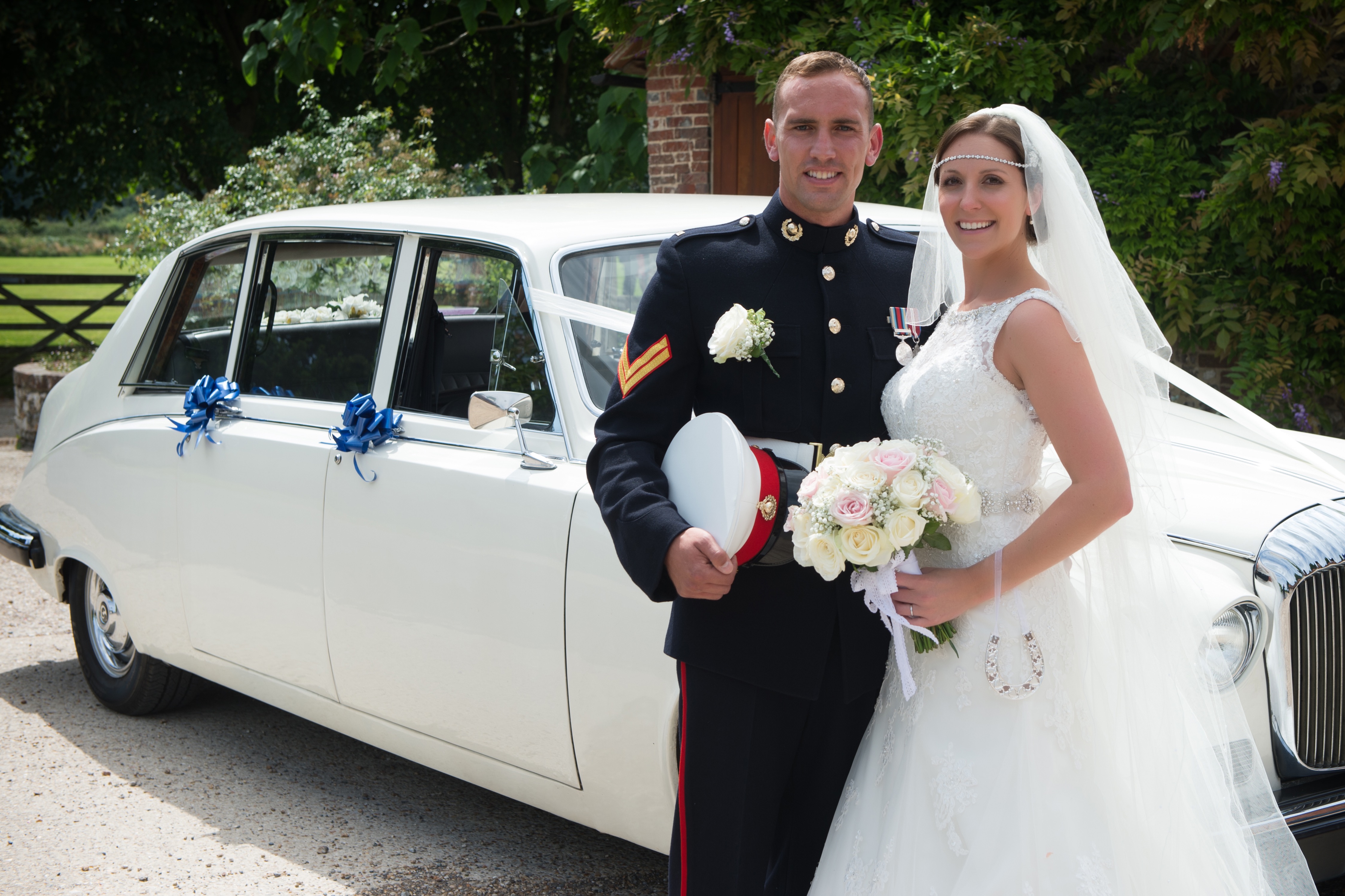 Wedding portrait: bride and groom in military uniform next to a white car.