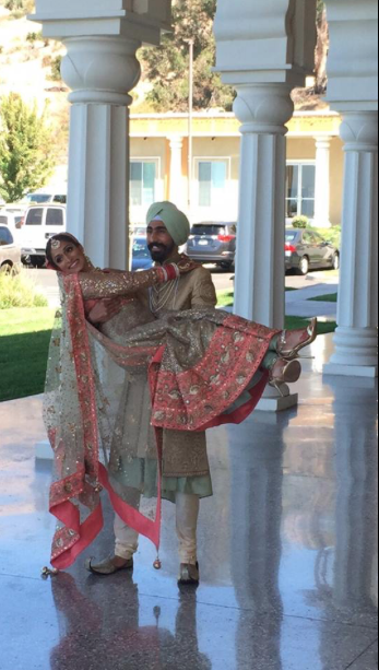 Painting of a Sikh groom carrying his bride in ornate wedding attire.
